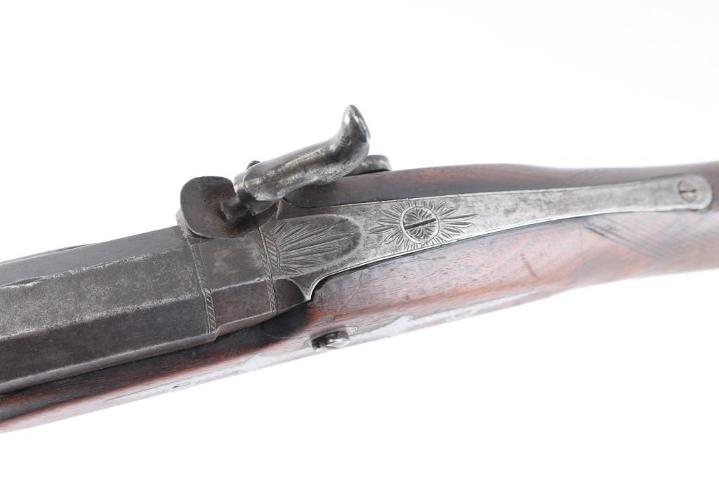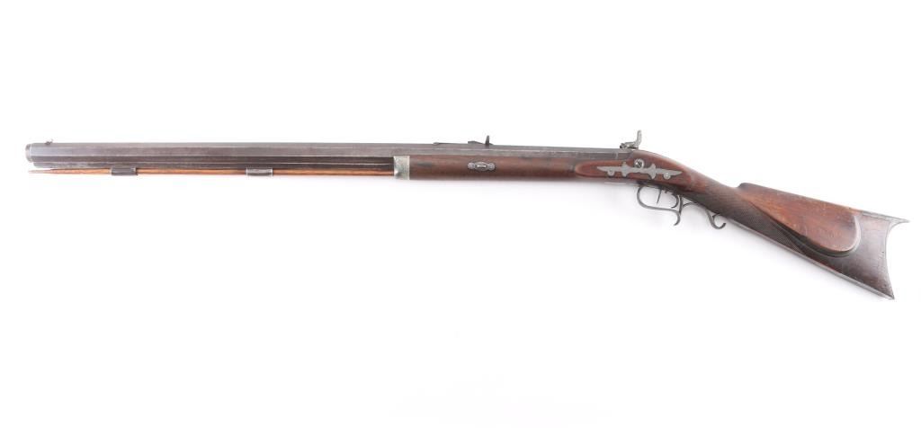 G. A. Nordheim, Yreka (California) marked percussion hunting rifle illustrated page 173 of California Gunsmiths by Larry Shelton, consigned by his estate. Thirty-two inch barrel measuring over 1" across flats and approximately 11 lbs. Half stocked, iron mounted with semi false muzzle. Unique to this maker, iron sideplate secured by 1 large and 2 small screws. Double-triggers, buckhorn rear sight. Nicely engraved iron mounts. Good overall condition with working triggers and good action. Minor wear and normal aging circa 1860s to early 70s. Yreka is in Northern California populated with bear and elk for which this 44 caliber rifle was intended. Condition is NRA Good***Antique Firearm***