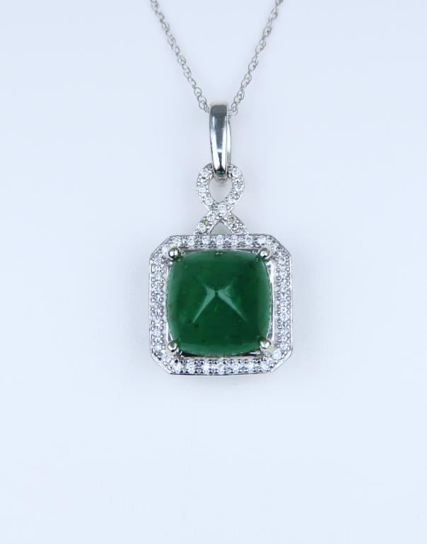 Cabochon Emerald and Diamond Pendant featuring a Natural Emerald with rich Blue Green color accented with 44 round Diamonds with H-I colors and VS clarity set in a detailed 14 karat white gold setting. Full Retail Appraisal - $7,800.00