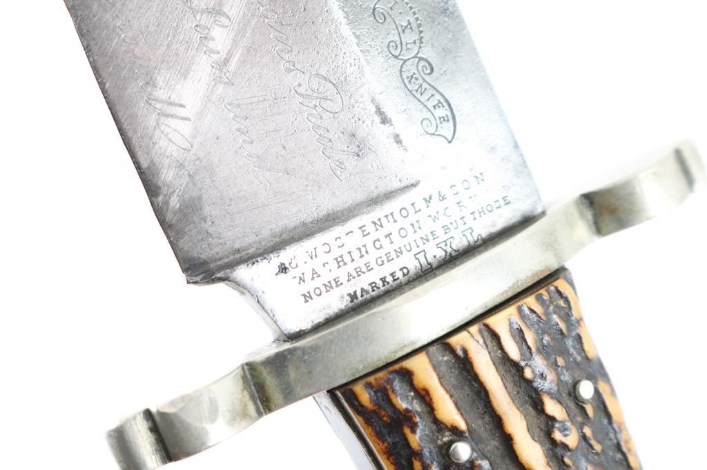 Circa 1849-50's. Trade marked also with "The American's Pride Equal rights Equal Laws and Equal Justice to all". Features a 9 9/16" clip point blade with stag grip w/ German silver mounts. Blade also stamped with Patriotic Eagle and "California Knife". No scabbard. Very good condition showing minor pinprick pitting, crisp markings and normal aging. Stag horn scales are well aged, deep patina and minor wear. Was showcased in the Texas Gun Collector's Magazine, 2000 Spring issue from the Joe Musso collection.