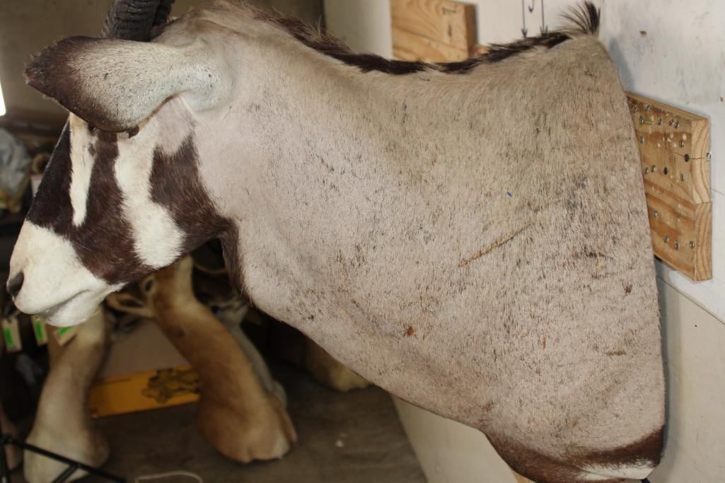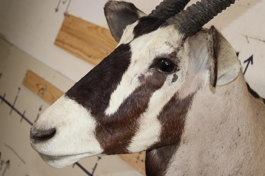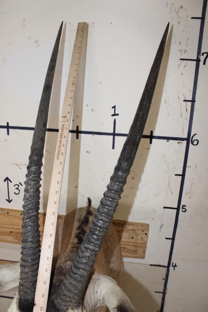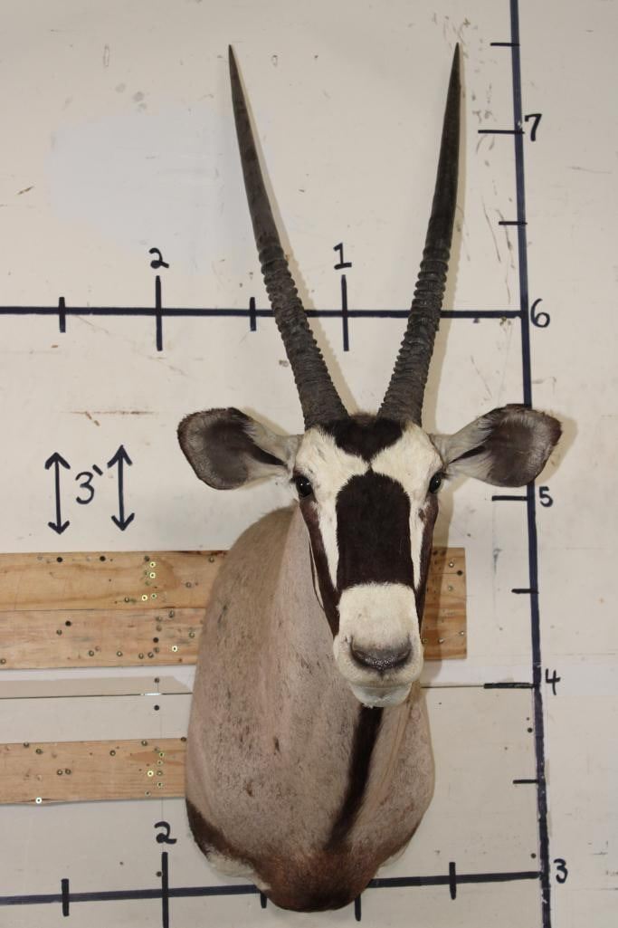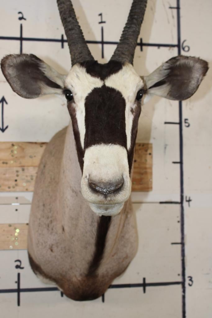 Nice GEMSBOK Shoulder Mount. The Left Horn measures 33 5/8" Long and 7 5/8" around the Horn Base. The Right Horn measures 33.75" Long and 7.75" around the Horn Base. It is in Good Condition. TAXIDERMY