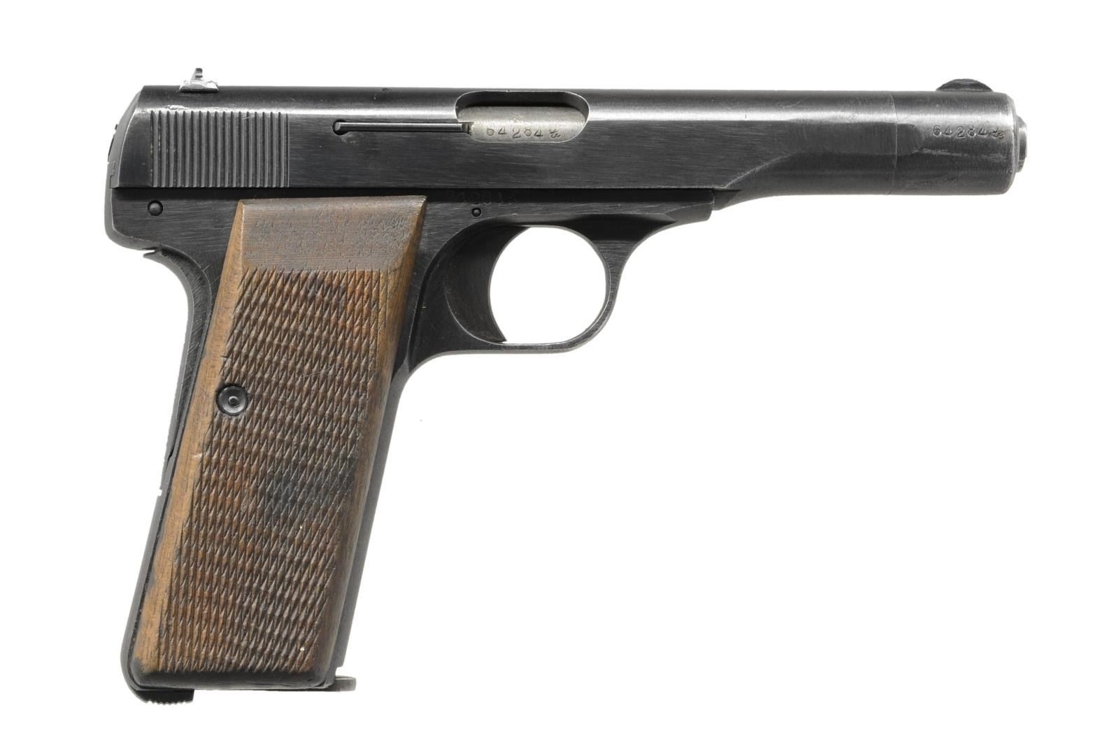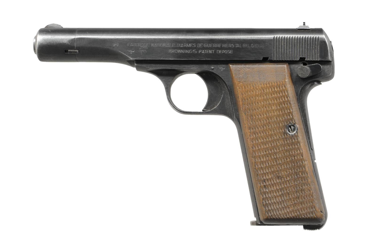 SEMI-AUTOMATIC PISTOL. Cal. 7.65mm. S# 64284b. Bbl 4 - 3/8". Model 1922 manufactured by Fabrique Nationale under German occupation during World War II. Blued finish with 2-piece checkered wood grips. Half-moon front sight with V-notch rear sight. Left side of slide bears the manufacturer stampings with 2 "(Eagle)/ WaA140" waffenamts. Matching numbers are present on the frame, slide, barrel, and slide extension. MAGS: 1 9-round magazine. CONDITION: Very good, with metal components retaining the majority of their original arsenal blue finish, exhibiting some mild wear and thinning that is mainly present on the slide extension that shows through to gray patina. Mirror bore, exhibiting well defined rifling throughout. Grips show some smoothing as well as a few handling marks and minor impressions, but are otherwise fine. (23-1862/MLW). CURIO. $400-600