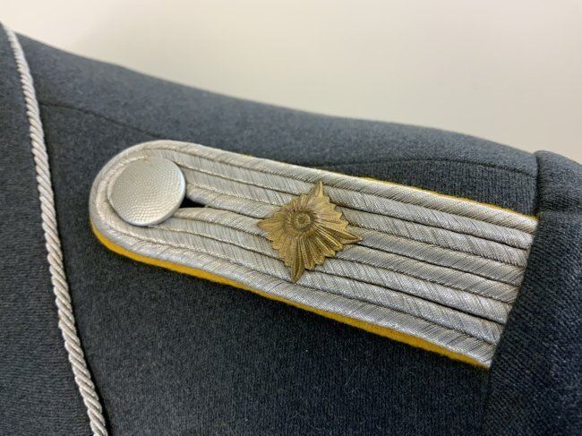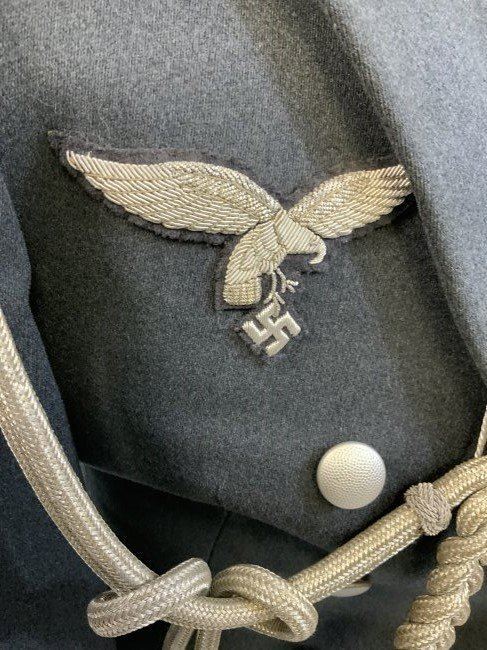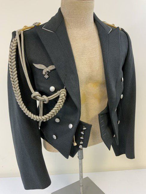 GERMANY THIRD REICH LUFTWAFFE EVENING GALA DRESS TUNIC AND VEST. MINT CONDITION TUNIC COMPLETE WITH DRESS SILVER WIRE AIGUILLETTES. COMES WITH VERY RARE VEST THAT WORN UNDER THE TUNIC. NAMED INSIDE. RARE FIND.