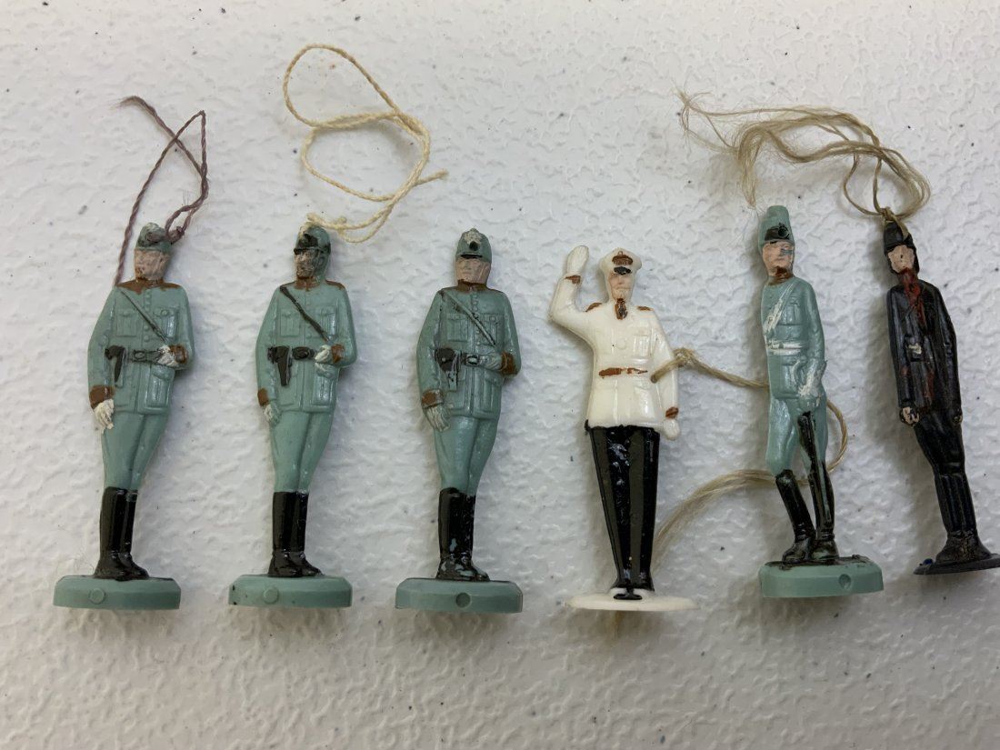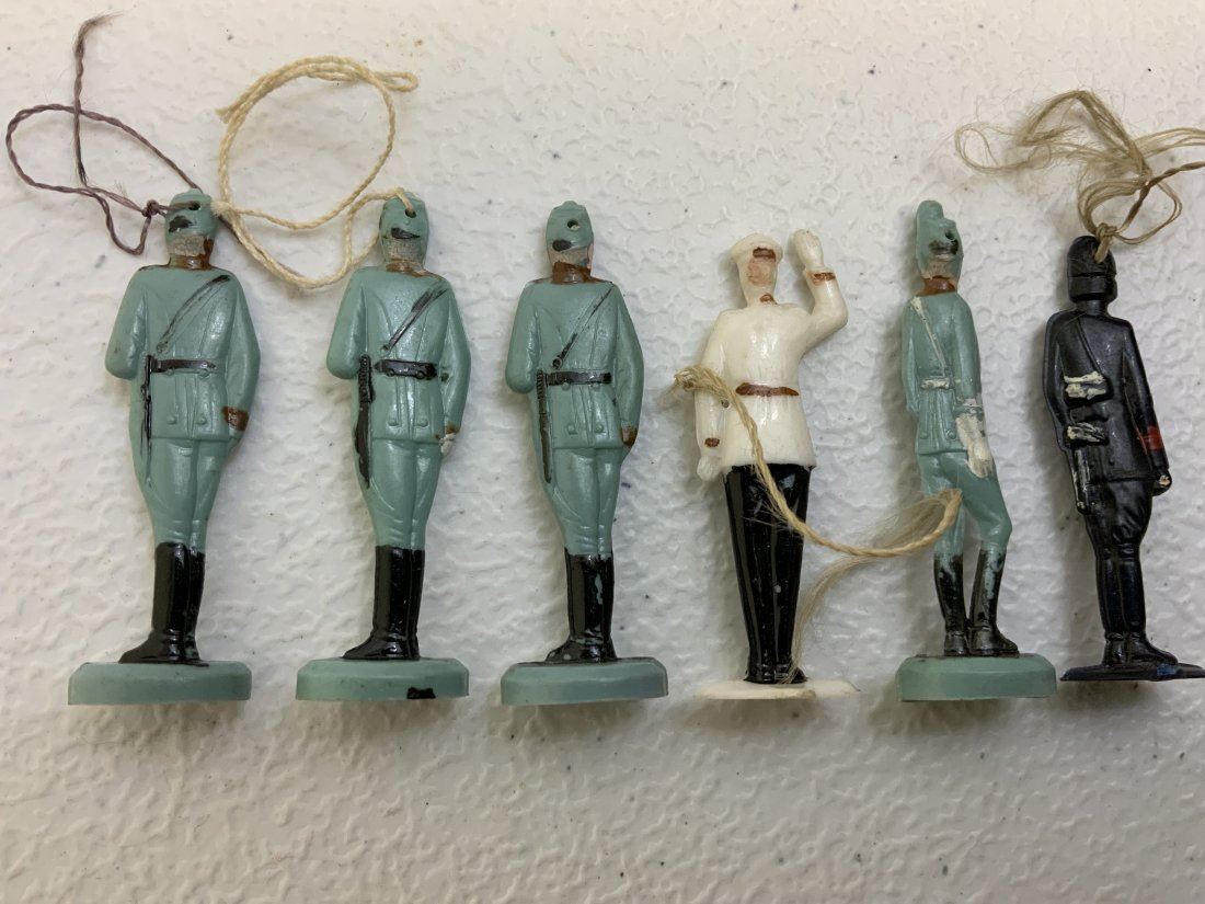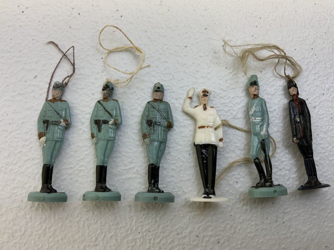 GERMANY THIRD REICH PLASTIC POLICE OFFICERS TOY SOLDIERS CHRISTMAS HANGING DECORATIONS. LOT OF 6 . SOME STILL RETAIN HANGING STRINGS .RARE .