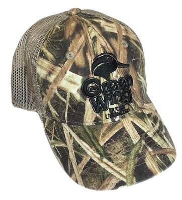 Trucker style baseball cap in a youth size . Features the Greenwing logo on the front. DU Mossy Oak Shadow Blades with tan mesh. Adjustable plastic snap closure. One size fits most.