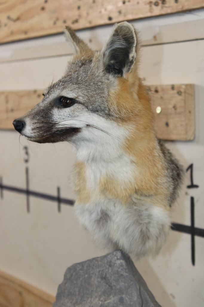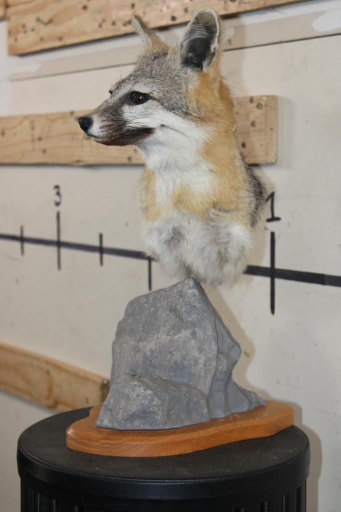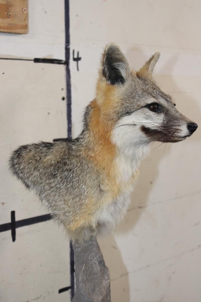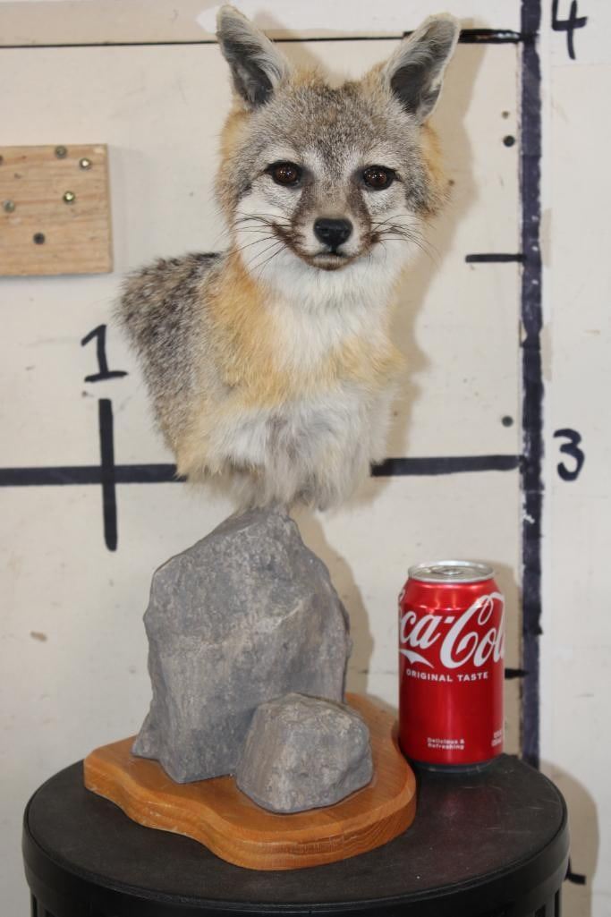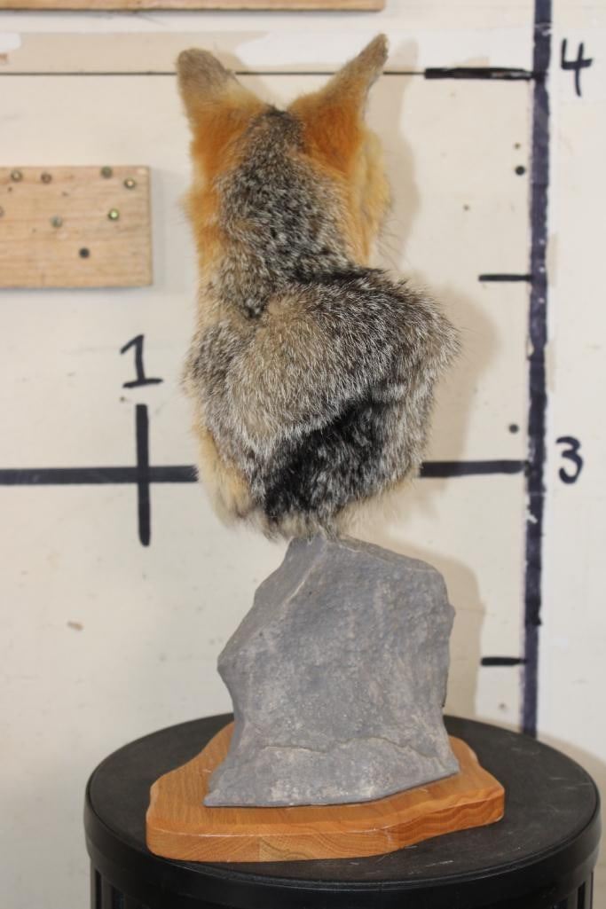 Very Nice and Clean GREY FOX Table Pedestal in Very Good Condition. The Mount measures 18" Tall x 9.5" Long x 8.5" Wide. The Fox is removable. TAXIDERMY