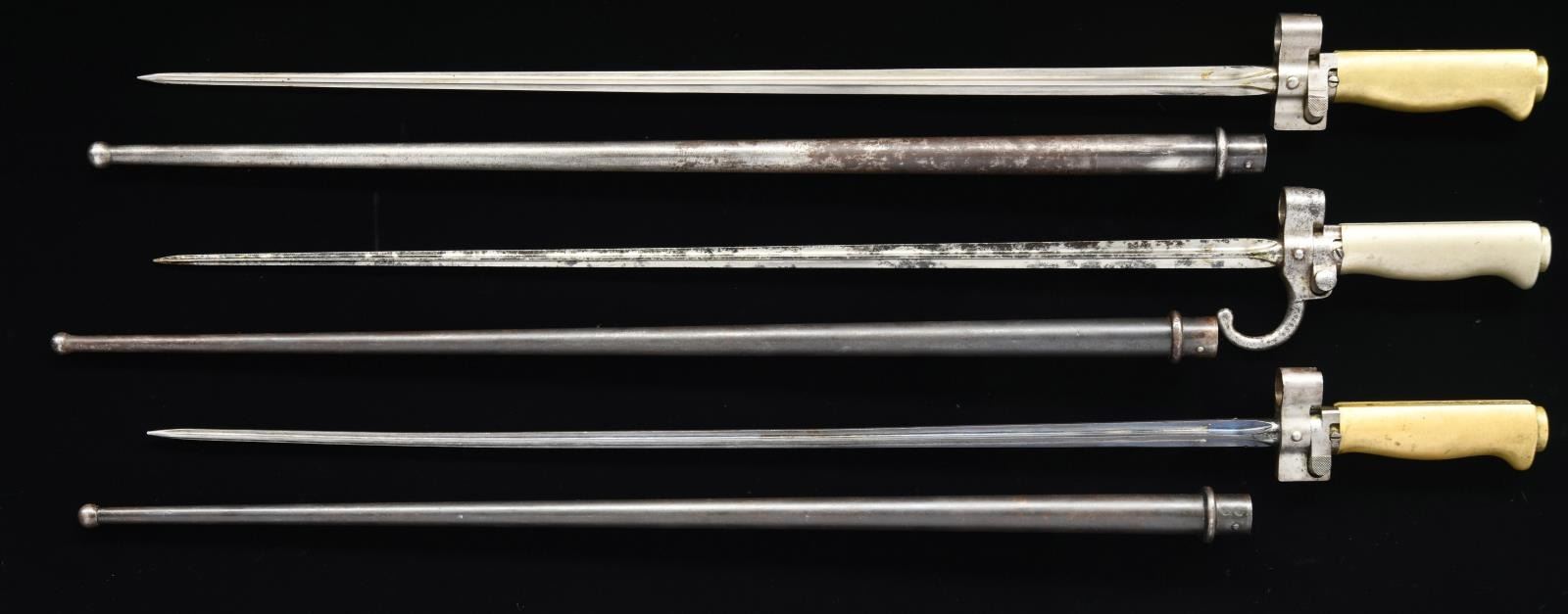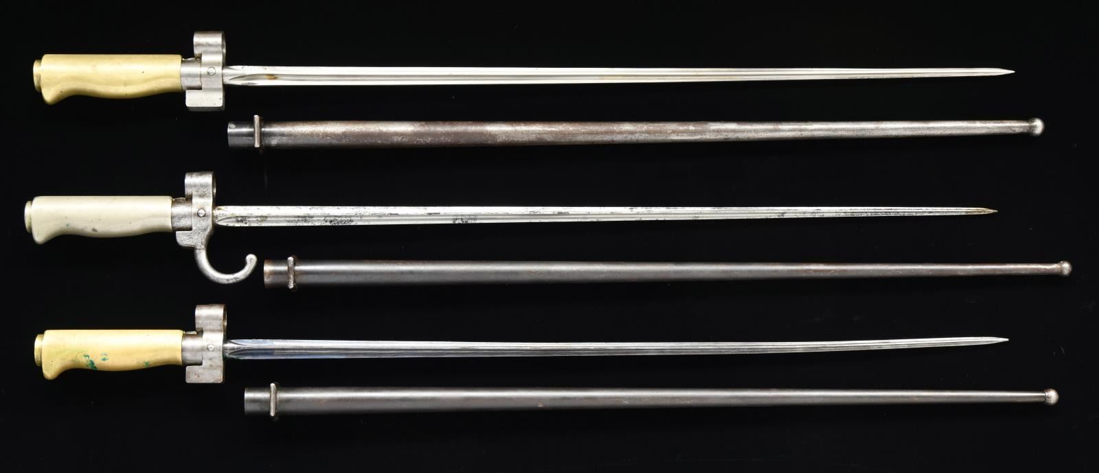 These bayonets were a radical change from the earlier long knife blade types & were reportedly well liked by the French troops. 1) 20 3/8" quadrangular blade bayonet. Crossguard w/ S# has a curved quillon. The latch has a smooth domed head. The handle is made from a silver colored alloy. Tubular steel scabbard. CONDITION: steel parts were originally bright but are turning gray & patina w/ light oxidation & very fine pitting. Handle has moderate wear. Scabbard retains 60% original blue finish. 2) 20 1/2" quadrangular blade bayonet. Crossguard w/ S#, made w/out curved quillon. Thumb piece is checkered. Brass handle. Unmarked steel scabbard. CONDITION: steel parts have light wear & scattered oxidation. Brass handle has light wear staining & handling marks. Scabbard has traces of blue turning overall gray & patina w/ areas of fine pitting. 3) 20 3/8" quadrangular blade bayonet. Blade is blue. Balance of steel parts are bright. Handle is brass. Crossguard w/out S#. Tubular steel scabbard. CONDITION: blade has worn thinning blue finish & is bent slightly upward but fits well in scabbard. Crossguard has checkered thumb piece. Brass grip has wear staining & handling marks. (02-19601-4/RW). $250-350.