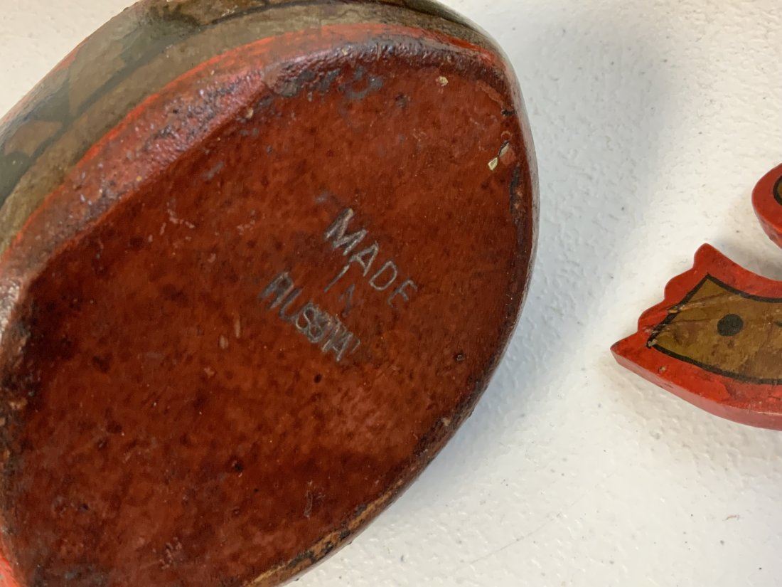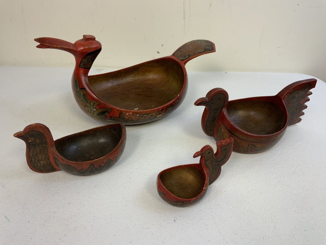 GROUP OF VINTAGE RUSSIAN KHOKHLOMA WOODEN SERVING BOWLS - KOVSHS . 4 PIECES. FROM 15" LONG TO 5" LONG. CIRCA 1930'S . BEARING EARLY USSR EXPORT MARKS.PAINTED IN RUSSIAN TRADITIONAL DESIGNS WITH MOSTLY FLOWER , BERRY AND LEAF PATTERNS. ALL IN GOOD CONDITION WITH SOME PAPER RESIDUE FROM STORAGE THAT SHOULD CLEAN UP NICELY. NICE COLLECTION .