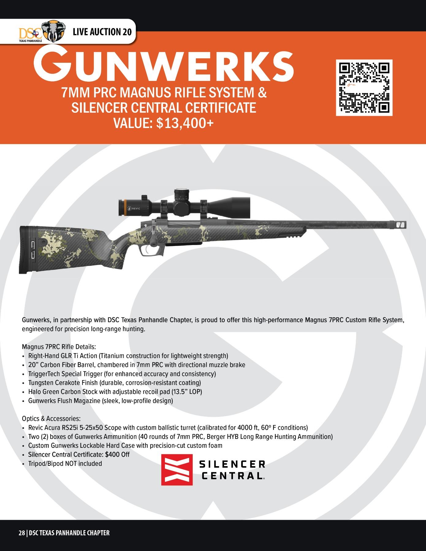 Gunwerks, in partnership with DSC Texas Panhandle Chapter, is proud to offer this high-performance Magnus 7PRC Custom Rifle System, engineered for precision long-range hunting.