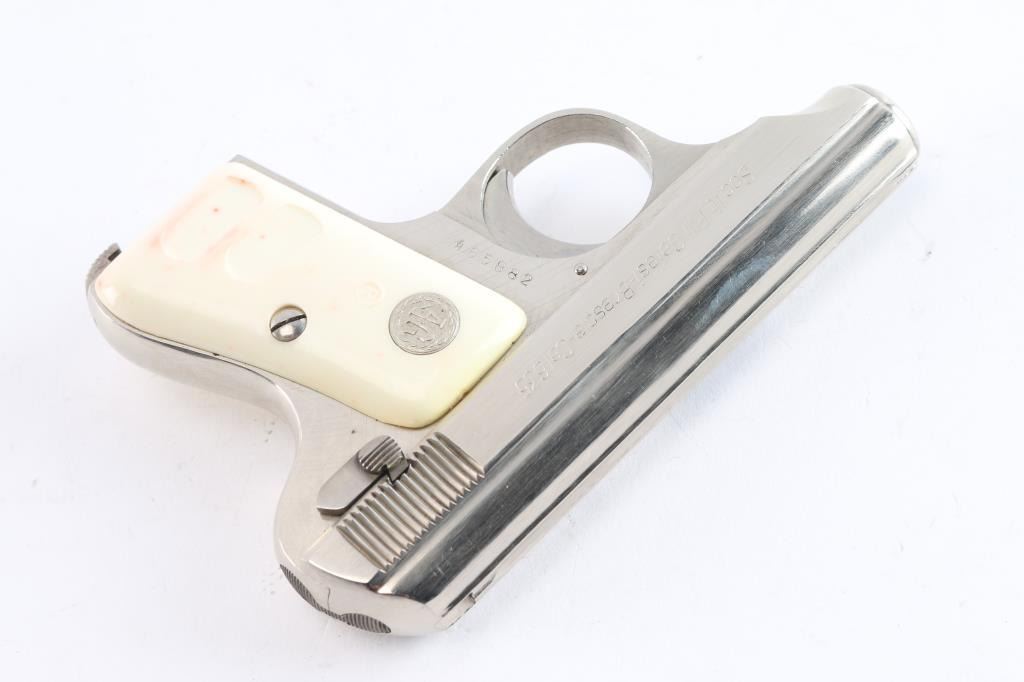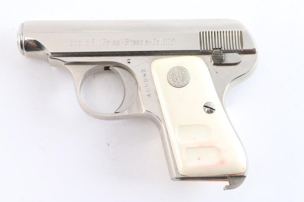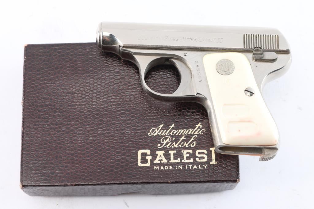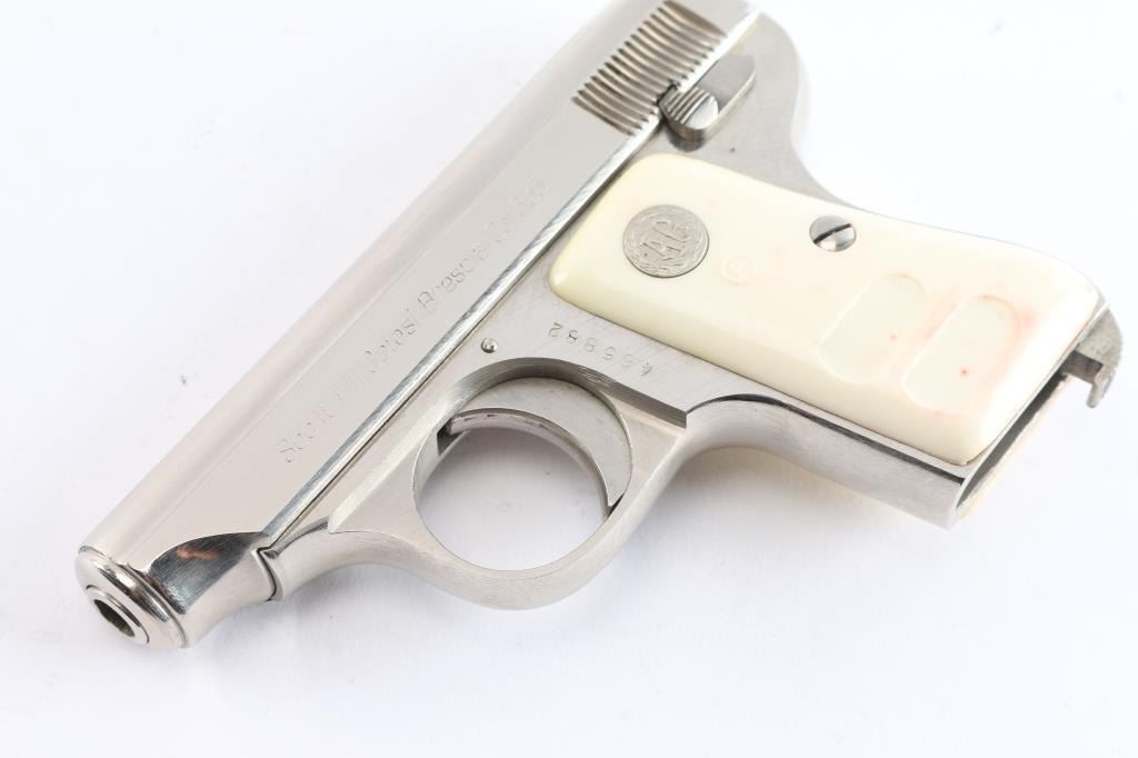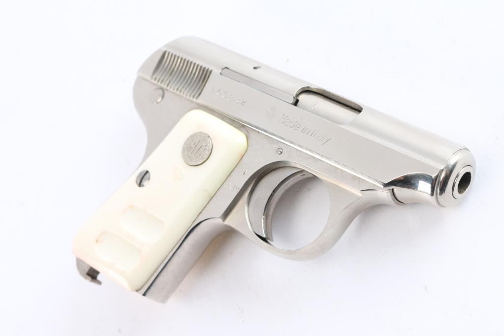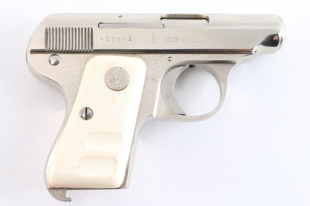 Striker-fired semi-automatic pocket pistol chambered in .25 Auto. Manufactured in Italy circa 1967 (XXIII date code). Features a bright nickel plated finish, fixed 2 5/16” barrel, diminutive fixed sights, smooth curved trigger, thumb safety/take-down lever on the left side of the frame, heel magazine release, no magazine, steel frame, and faux-ivory plastic grips with silver “AG” medallions. Includes the original factory two-piece cardboard box with matching end label. Pistol retains approximately 99% of its original finish showing handling marks and factory machining marks under the finish. The action is mechanically sound, the bore is bright with striations on a single land, and the plastic grips are very good with some red staining.