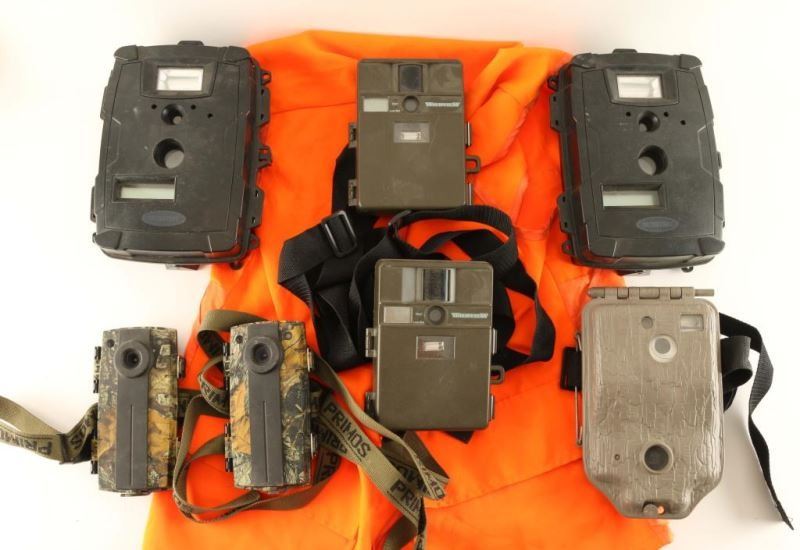 Including; 2 Moultrie game cameras, 2 Wildview game cameras, 2 DPS cameras, and a blaze orange vest with flap pocket to hold shells.