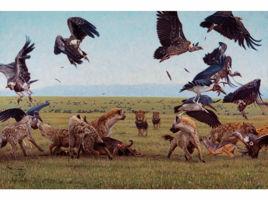 “Game of Lions” by John Banovich - “Deep in the heart of every lion lives an ancient hatred for hyenas, never missing an opportunity to beguile their nemesis. For millennia this turmoil has reached far beyond the competition for food. It is a war between eternal enemies. These hidden battlefields remind us of a time when our own nights were filled with bloody darkness…The composition is what makes this painting work. The concept was to create a bull’s-eye effect, centered on the male lions running into the pack, and sparking a centrifuge of energy erupting all around them, while the vultures, marabou storks, hyenas and jackal escape their wrath. Lions are a subject I have painting many times before but this will remain as one of my favorite lion paintings yet.” John Banovich 58” x 78.5” www.johnbanovich.com