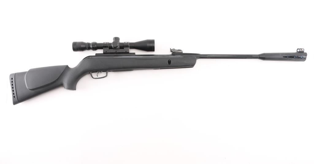 Single shot break-barrel spring powered .177 cal. air rifle, made in Spain. Features black finish, black polymer stock, 20.5" fluted barrel with integrated noise dampener, fiber optic insert adjustable sights, manual safety, 'shock wave absorber' recoil pad. mounted with a Gamo 3-9x40 scope. Very good Condition.