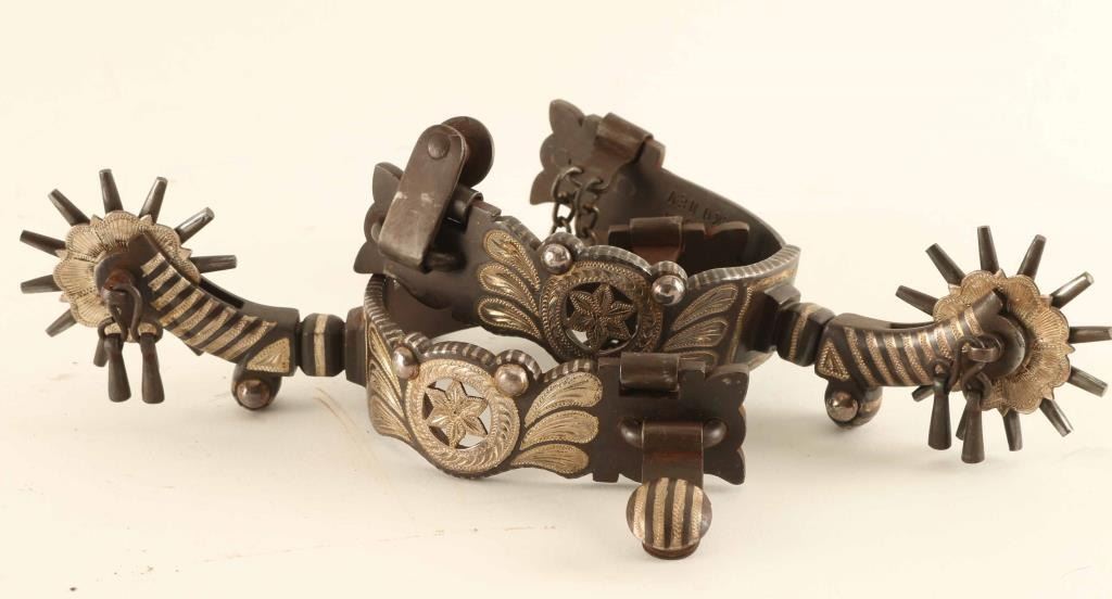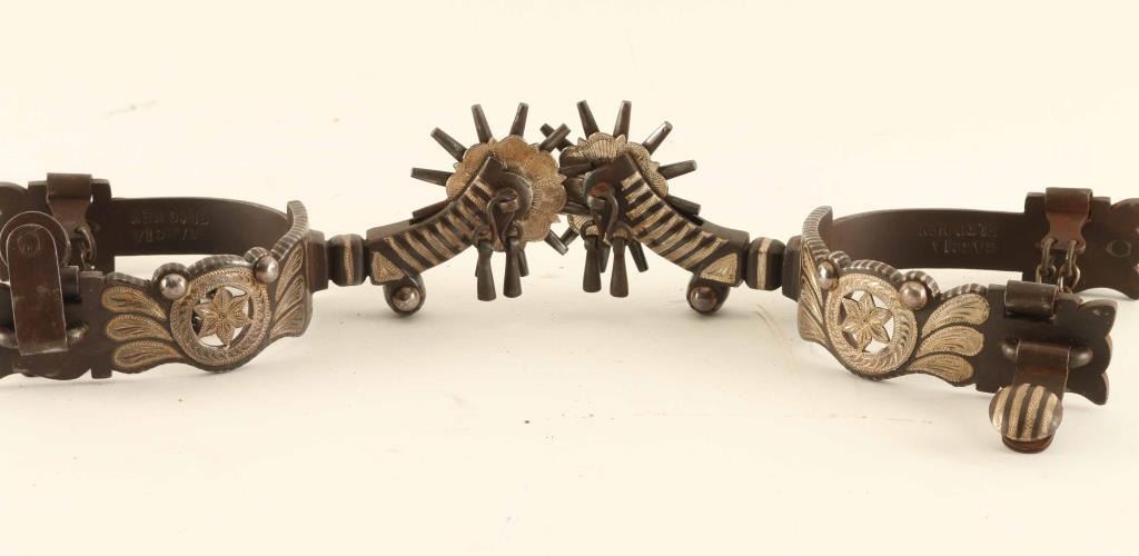 Lot includes brown finish show spurs by Garcia with beautiful inlay work, jingles, and 2" rowels.