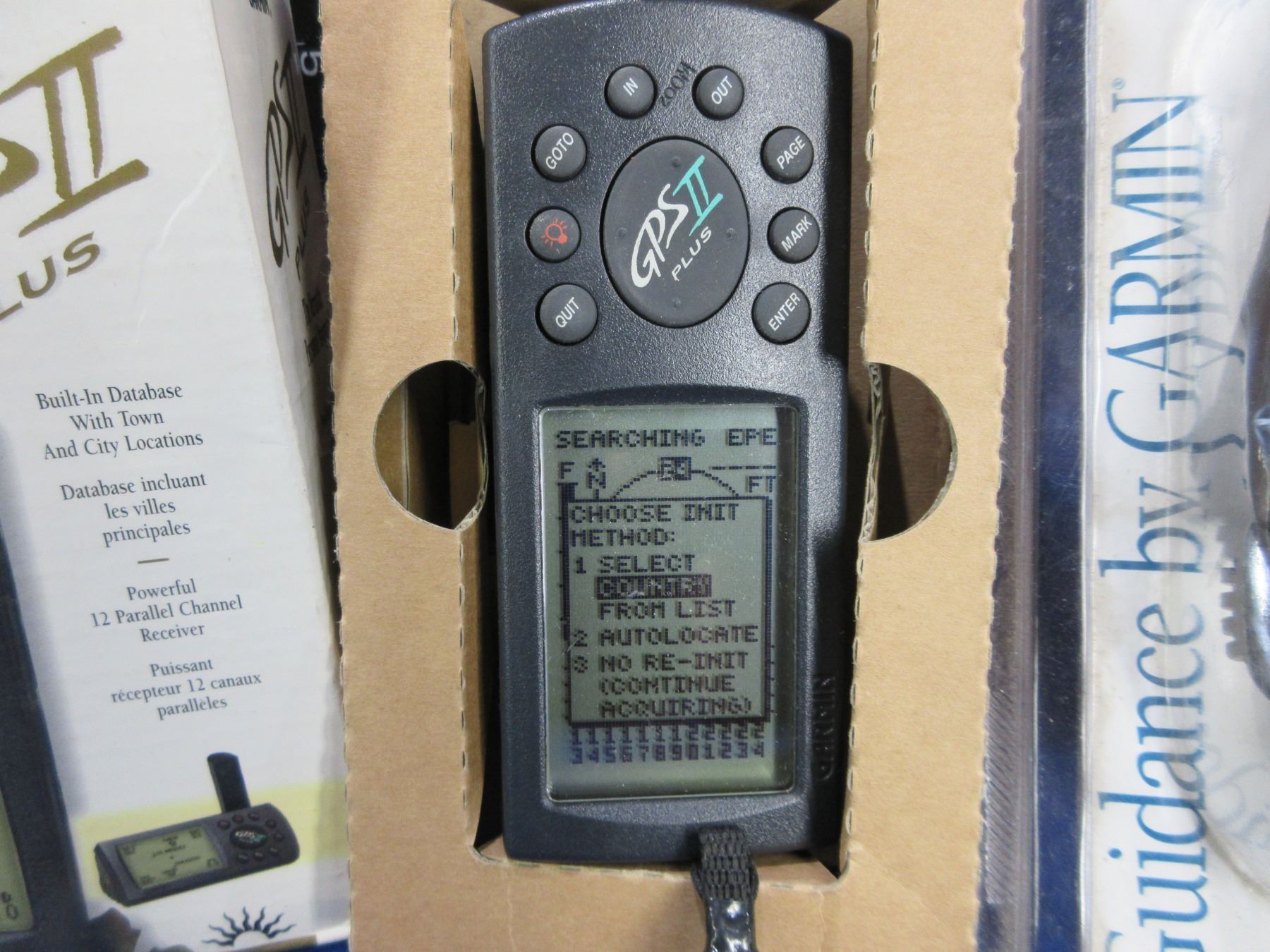 Garmin GPSII Plus Personal Handheld Navigator - New Old Stock - Comes with manual, cigarette lighter adaptor and carry case - Tested working at time of cataloging (turns on)