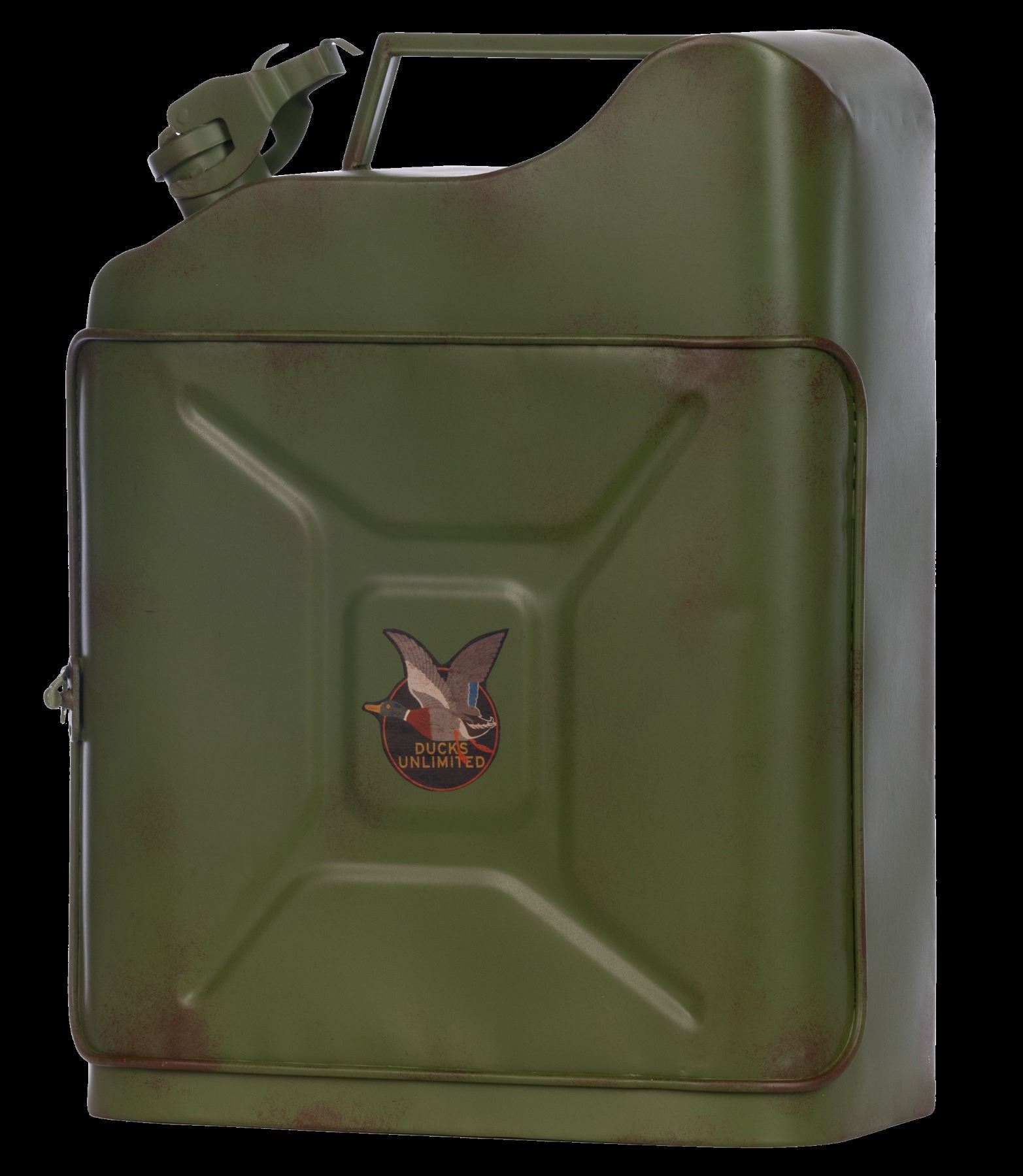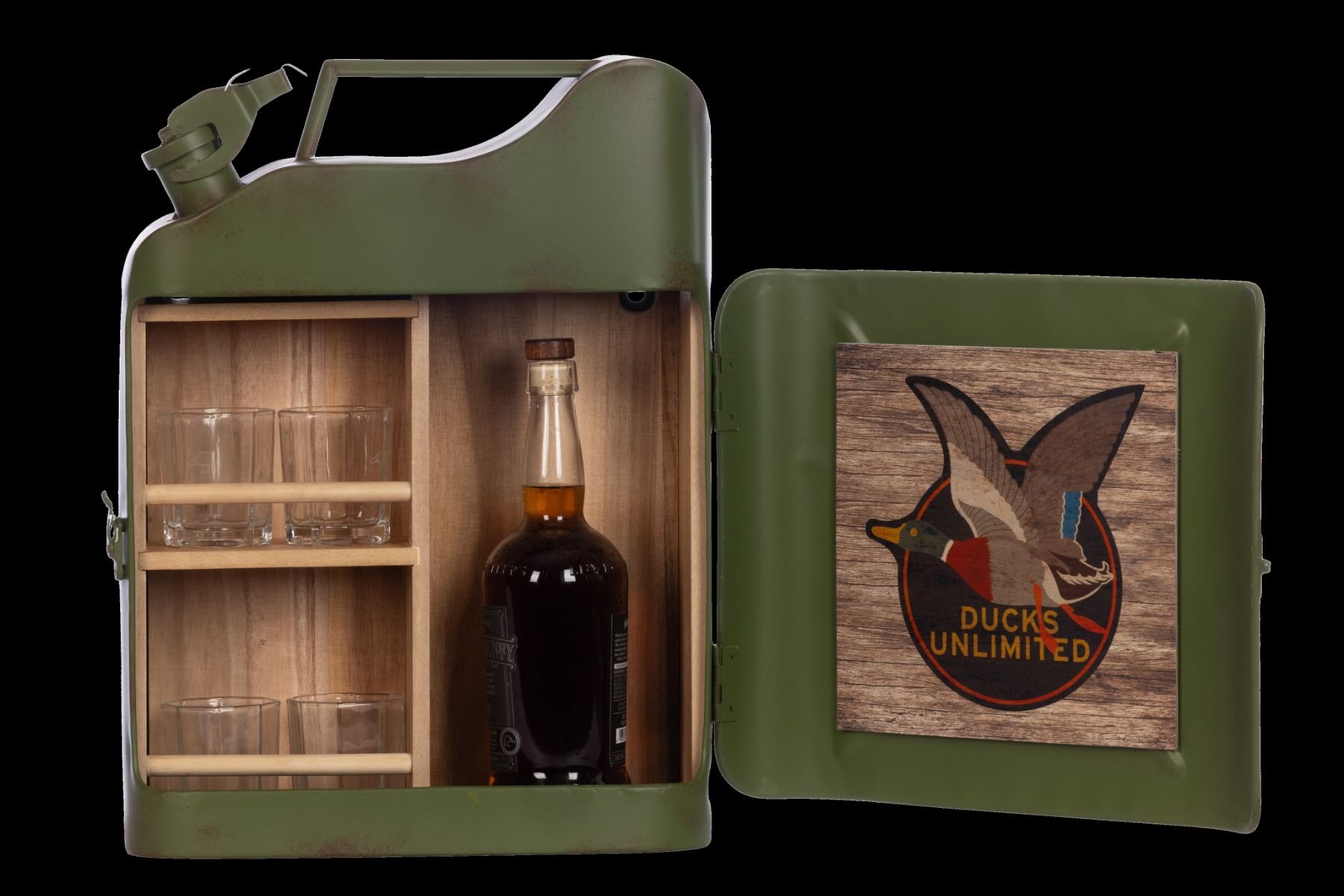 The Metal Mini Bar is a distinctive and stylish addition to any space, designed to resemble a vintage gas can.This unique mini bar can hold a bottle of your favorite spirit and includes four glasses, each etched withduckhead logos, adding a touch ofelegance to your drinking experience. The DU Vintage logo is prominentlyfeatured on the front of the gas can and inside the door, enhancing its classic appeal. This compact yet eye-catching is a perfect addition to any home bar or man cave. Sourced by Sourcing Specialist Troy LaRue.