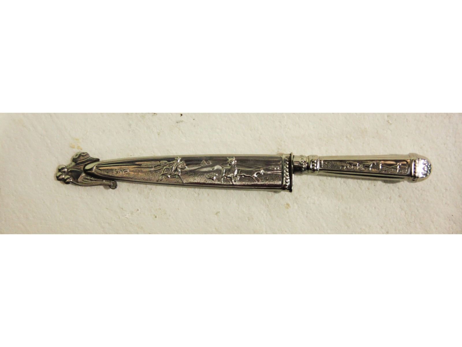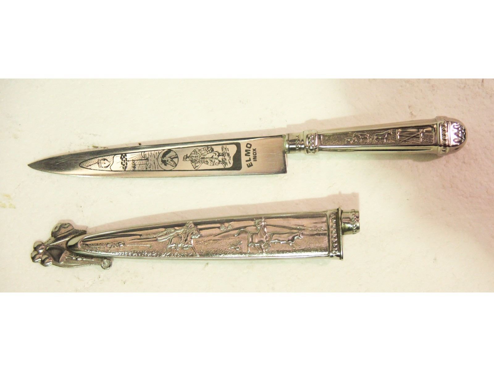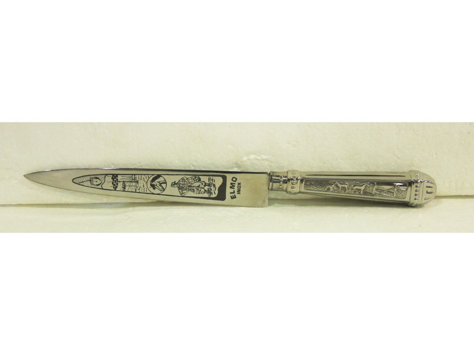 Blade measures 6", overall measures 11.25". Embossed blade marked Elmo, Inox. Embossed scabbard showing scene of gaucho and cow.. Bright blade, scabbard, and handle. Horses embossed on handle.