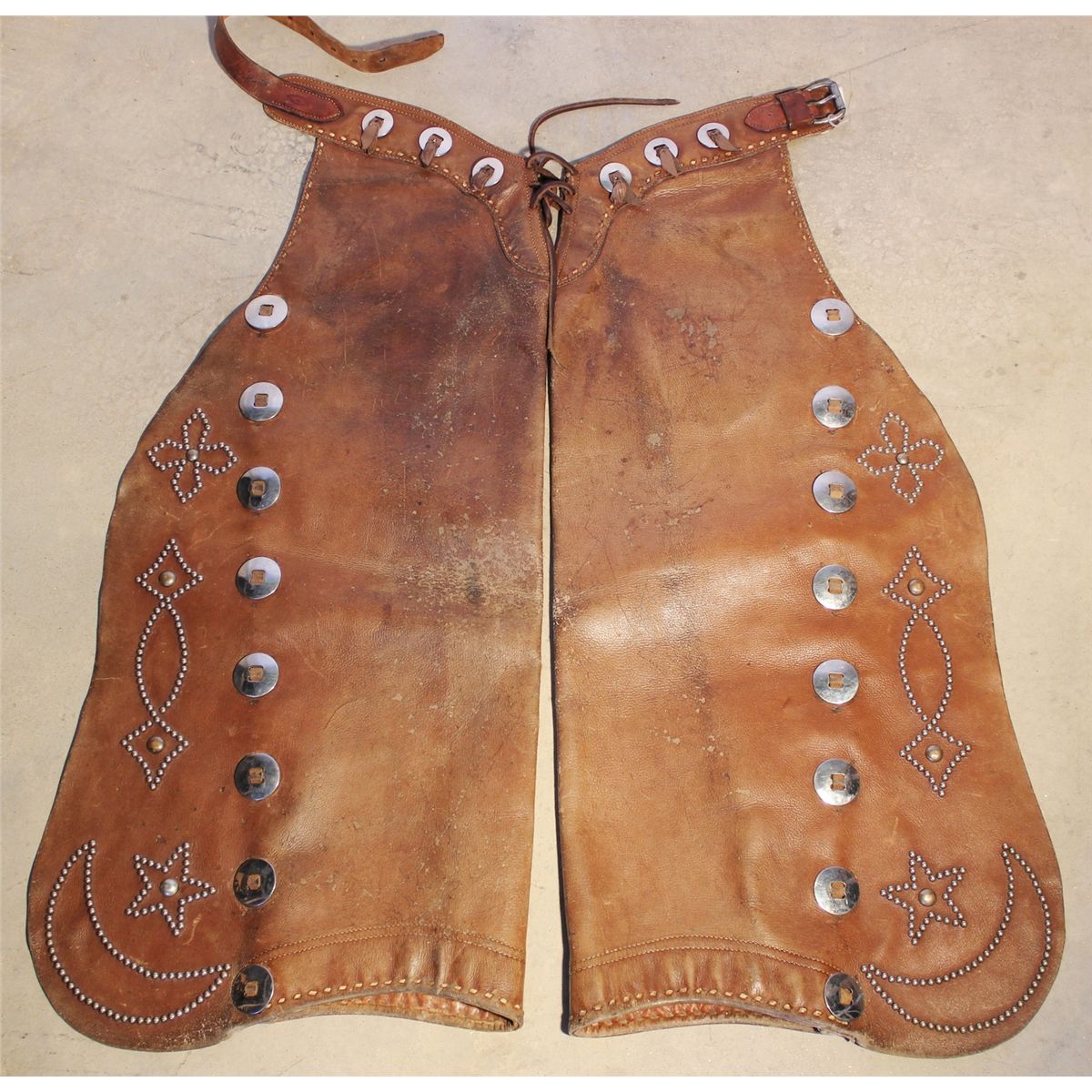 George Lawrence Cowgirl Studded Batwing Chaps; with an attractive stud pattern of stars and moons, having 22 nickel conchos, and nicely marked on the belt.