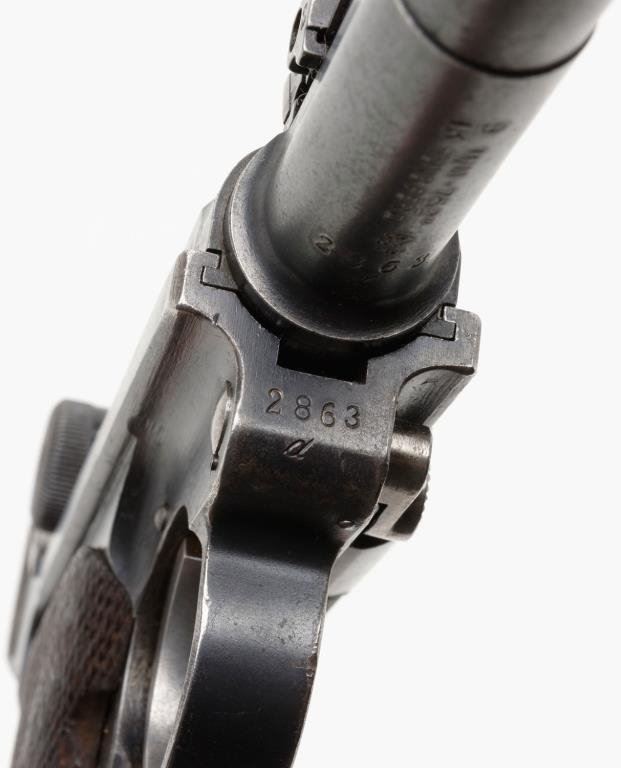 **German 1917 Artillery Luger by DWM semi-automatic pistol, British proofed, 9mm caliber, 7.75” barrel, S/N 2863 d, matching numbers except wood base WW II FX0 magazine that is #5840; fine tuning front and rear sights; 80-90% blue, good bore, action and markings; very good grips. Est.: $1,250-2,500