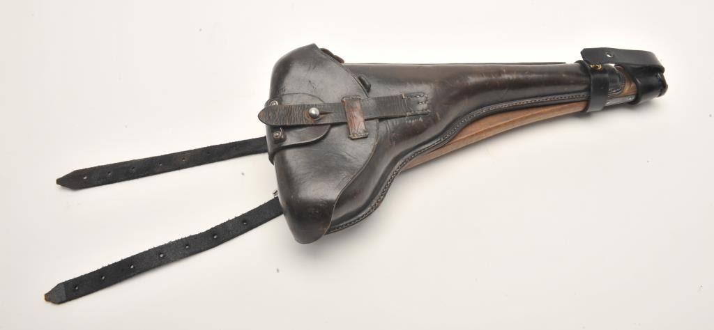 German 1917 DWM Artillery Model Luger semi-automatic pistol, 9mm caliber, 8” barrel, military blued finish, checkered wood grips, S/N 8544h (all matching visible numbers except magazine (S/N 4310m); finetuning rear sight; matching wood shoulder stock (S/N 8544h); leather flap holster; additionally accompanied by a drum magazine, takedown tool and wood handle cleaning rod. This Luger is in overall very good to finecondition showing the majority of its blued finish with considerable straw finish to small parts; fine bore, crisp action, sharp markings and very good grips; the stock is very good overall and the holster is goodwith replaced modern securing straps. (C&R/No PPT/Drum Magazine not deliverable to Calif. Residents). Est.: $2,500-$5,000.