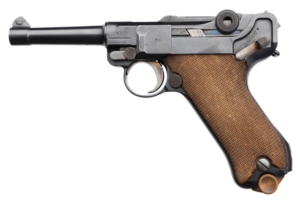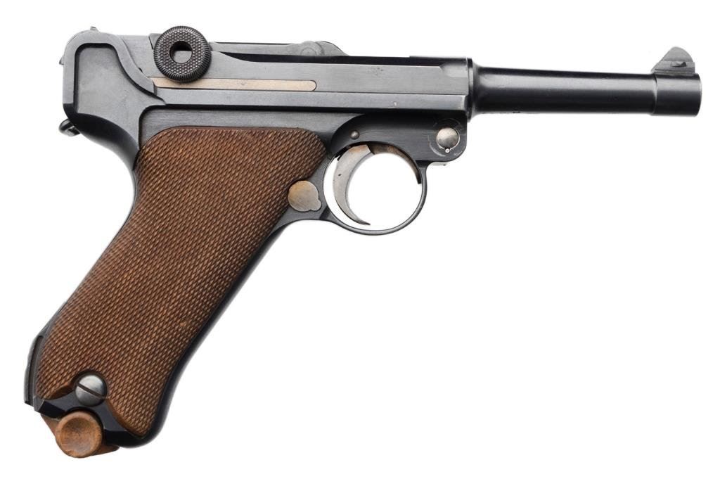 **German DWM 1920 Commercial Luger semi-automatic pistol, .30 cailber, 4” barrel, S/N 4139 h, 95-98% original finish, some discoloration on straw finished small parts, otherwise near fine overall with near fine bore, crisp action and markings and near fine grips. Est.: $800-$1,600.