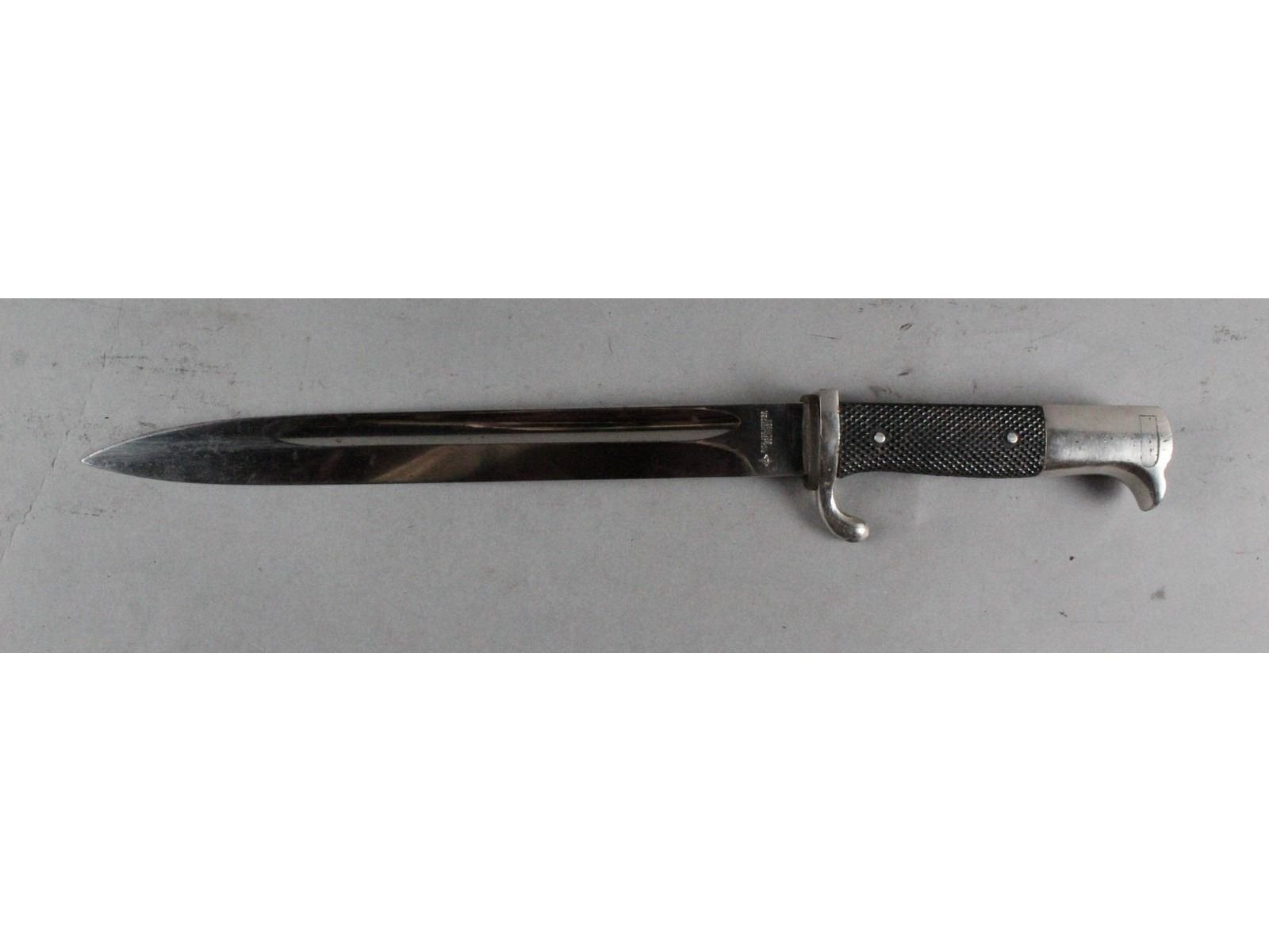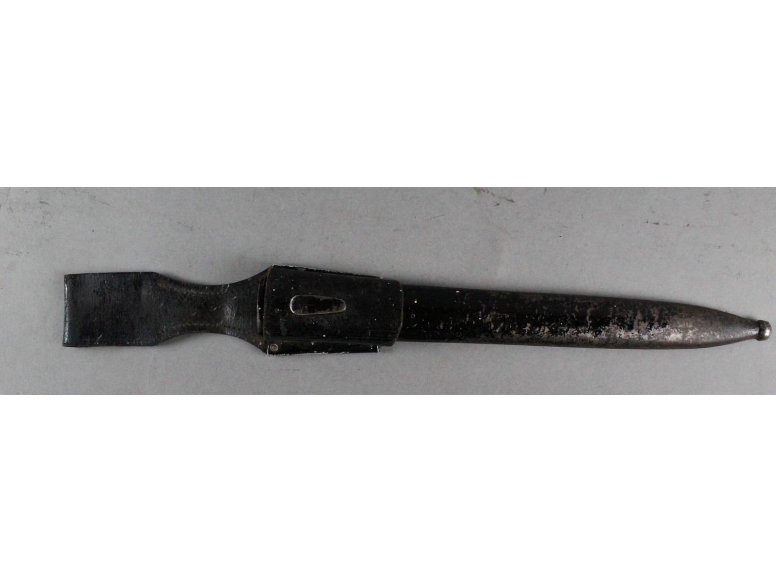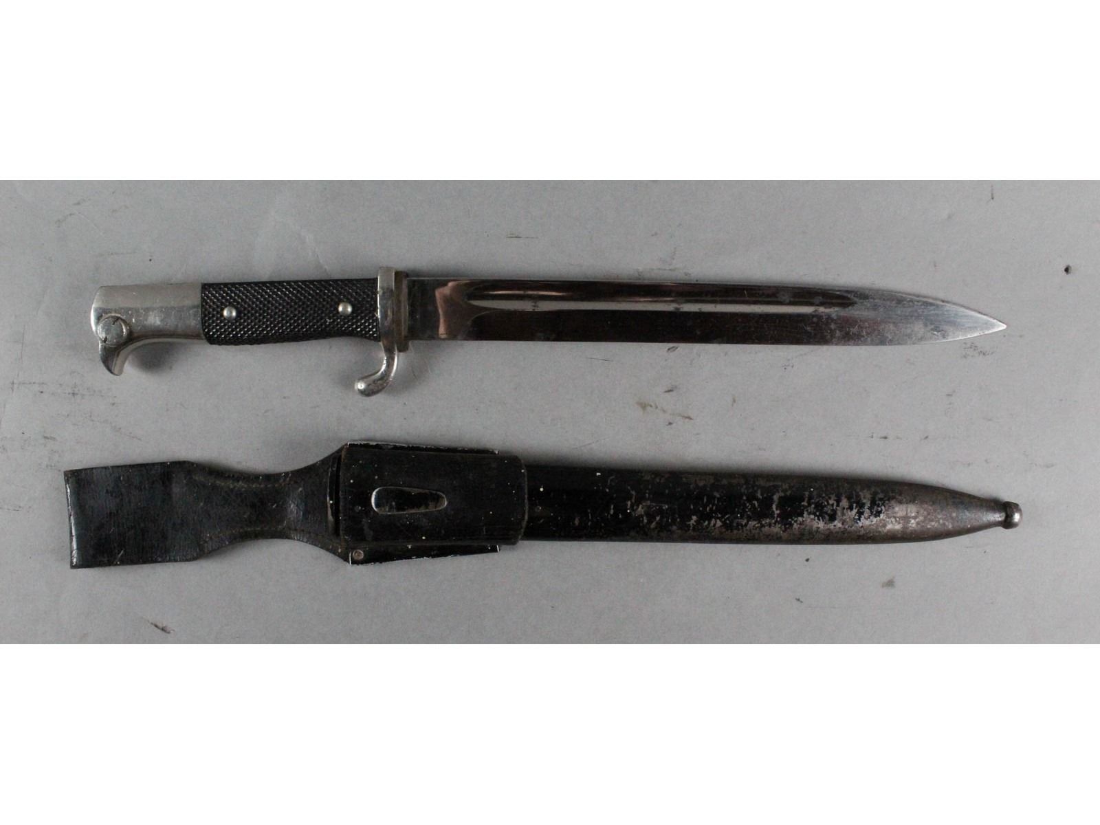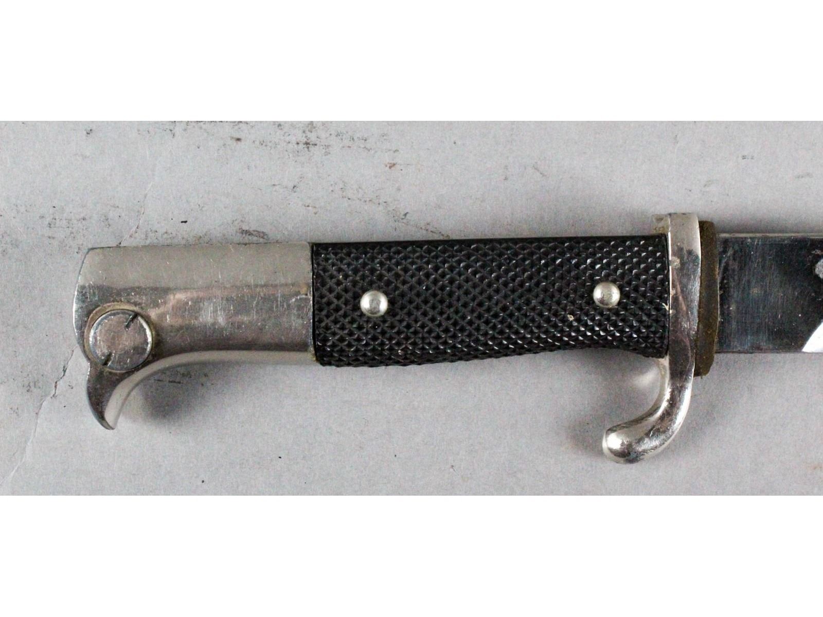 Blade measures 9.75", overall 16.25". Blade in good condition but slightly loose. Has Rich. ABR. Herder & Solingen mark. Grips are nice but show slight wear. Partial red felt in slot. Some pitting on tang. Paint has worn off bottom half of scabbard but there are no dents. Unusual dress scabbard with metal backing plate marked D.R.P.