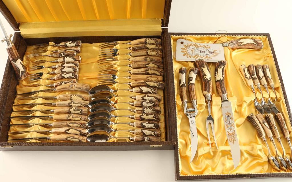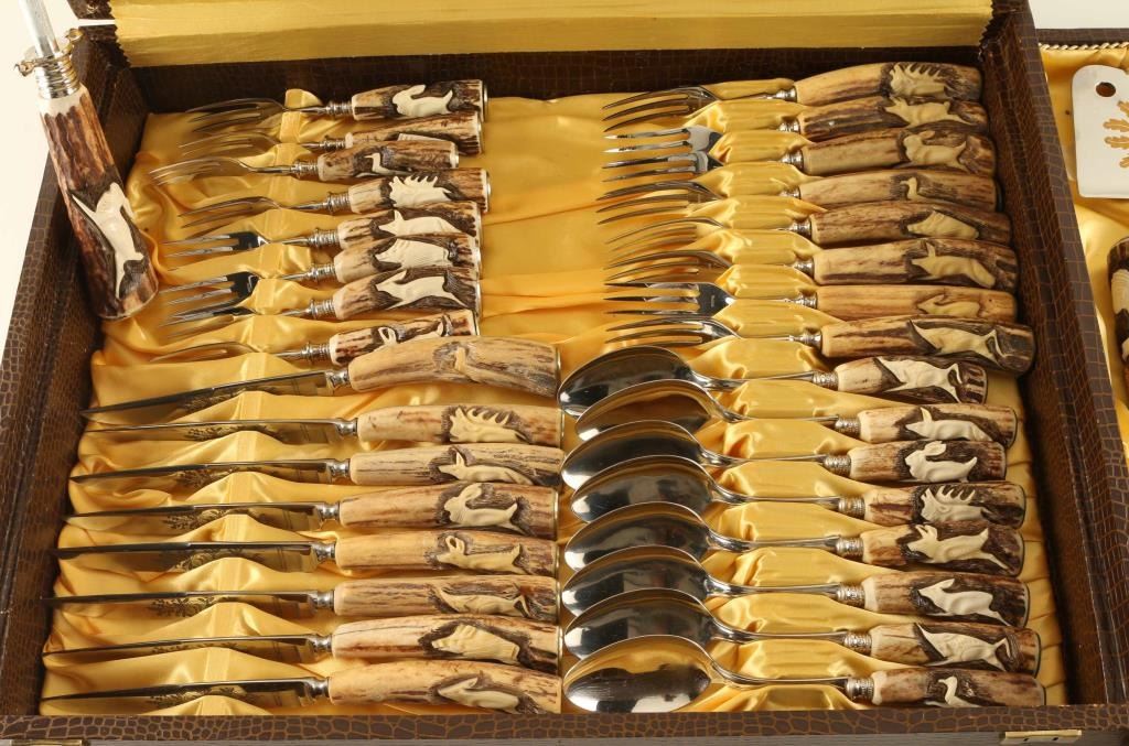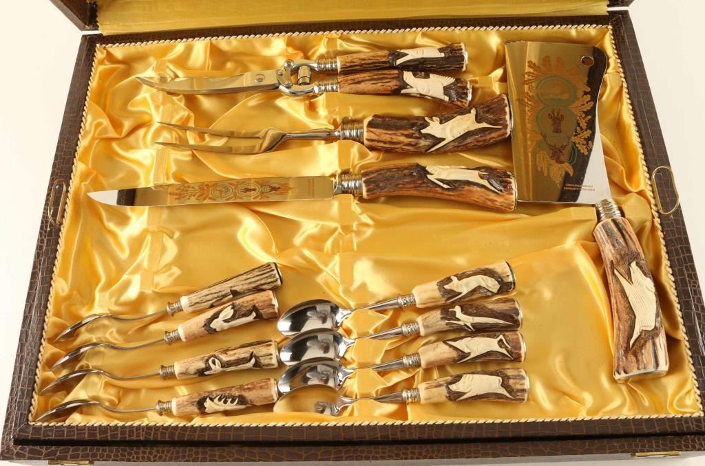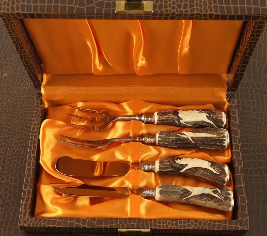 marked Stainless forged Germany Solingen with antler handles that carved with animals,etched blade with hunting scenes, 8 piece set includes extra carving set and cheese and meat serving pieces in beautiful yellow satin case wrapped in faux alligator. Like new unused, simply beautiful.