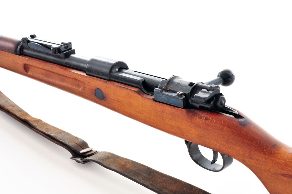 German Gewehr 98 Mauser Bolt Action Rifle, #5234, 8x57mm cal., 29.3'' barrel, blued finish, hardwood stock, inverted ''V'' front sight with attached protector and adjustable tangent rear sight. Marked on receiver ring with ''(crown)/AMBERG/1917'', and on left side receiver rail ''GEW.98''. Rifle appears to have been arsenal re-built with right side of barrel below rear sight stamped ''S/42'' along with two ''(Eagle)/WaA63'' inspection stamps. Right side of buttstock has faint original cartouches with an added ''flaming grenade'' stamp. Matching numbers on bolt handle, mismatched numbers on stock and other parts. Condition overall is very good with almost all of the dark blue refinish remaining on metal surfaces. Stock has been sanded and refinished, showing a few light scratches and an area of roughness on the right side below the rear sight. Action is smooth, bright bore is very good. Sight protector with spring muzzle cap, cleaning rod, and leather military sling in good condition included. No visible import stamps. Est.: $500-$800. (C&R)