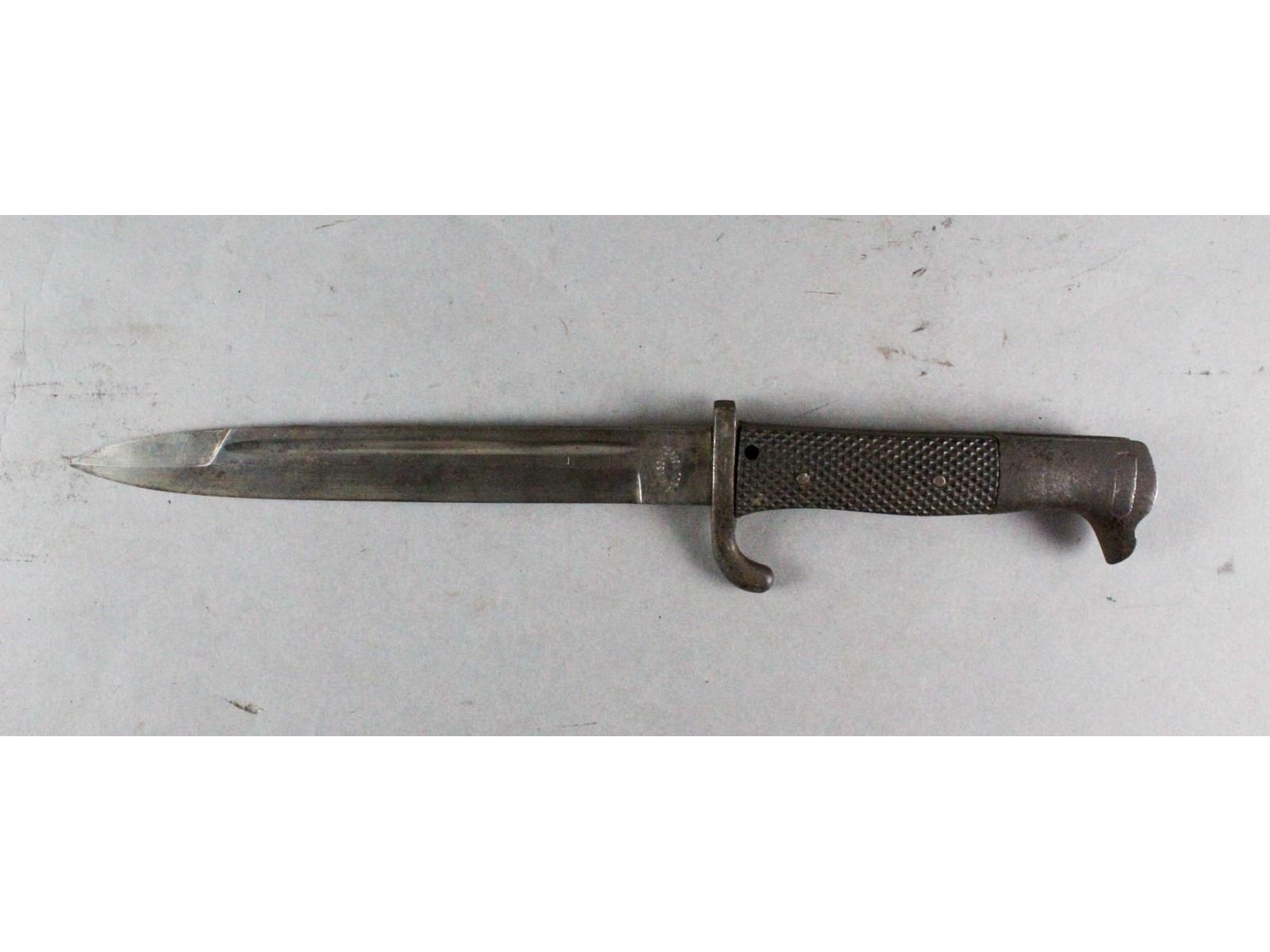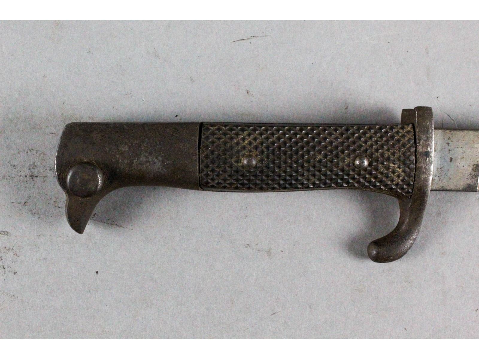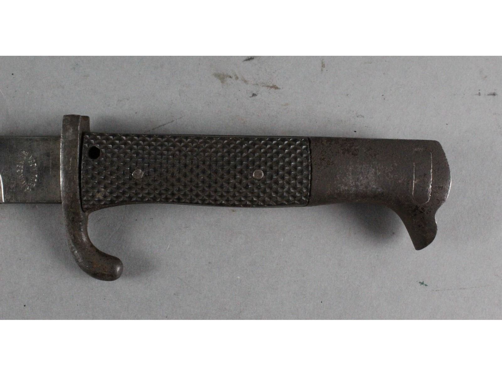 Blade measures 7.75", overall 12.75". No scabbard. Carbine blade in worn condition. Missing extreme end of tip. Made by A. Wingen Jr. Solingen. Dress grips with 2 rivets, in good condition. Small hole drilled in left grip near cross guard. Pommel and cross guard show heavy age patina.