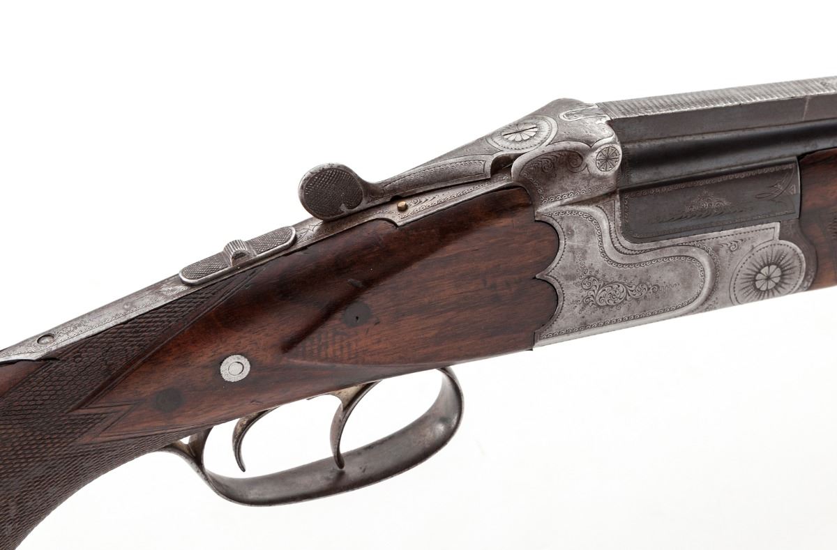 German Mfg'd Over/Under Boxlock Shotgun for Charles A. Heyer & Co., Nairobi, #41009, 12mm (.410 bore), 3'' chs., 25'' blue finish Kruppstahl barrels with 5/16'' solid matted rib and front silver bead, sling eyelet, choked IM., single crossbolt with Nitro chamber proofs and 3/26 date code, double triggers with cocking indicator pins, extractors and manual top-tang safety. Case-colored scalloped frame has light Germanic scroll and border engraving which carries to the chamber flanges. Checkered round-knob stock and long Schnaubel forend have a light oil finish with beaded cheekpiece. Length of pull is 14-3/4'' over a 1'' ribbed horn buttplate. Stock is reinforced with one original and two additional crossbolts through the wrist. Left side panel is stamped ''K.A.''; weight is 6-3/8 lbs. Overall condition is good with bright bores and tight action. Barrel blue is 85% with scattered oxidation and scratching. Frame exterior is drifting to a silver patina with 10% remaining case colors; face and barrel breeches have oxidation and verdigris. Stock and forend have denting and worn checkering with a chip out of the wood at upper tang. Rear sling eyelet is missing. Est.: $800-$1,200. (C&R)