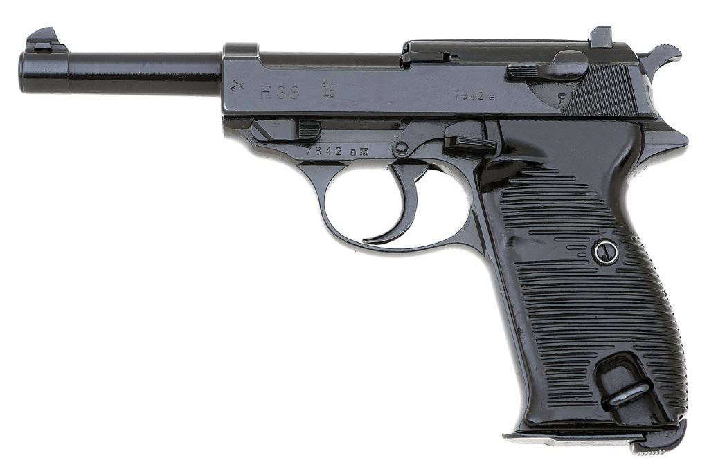 serial #7842a, 9mm, 5'' barrel with bright very good bore showing light pitting, oxidation, and strong rifling throughout. The metal surfaces on this ac/43 marked pistol retain 97% arsenal applied blue with spots of light oxidation, pinprick pitting, and light edge wear. All numbered parts are matching. The frame and slide have correct ''eagle / 359'' Waffenamt marks with a Russian ''X'' at front of slide and the rear of the frame is importer marked. The grooved Bakelite grips rate excellent with minor handling marks. Included is one ''P.38'', ''eagle / 359'' marked magazine with light operational wear. The action seems to function well mechanically. (10A11725-1) {C&R} (700/900)