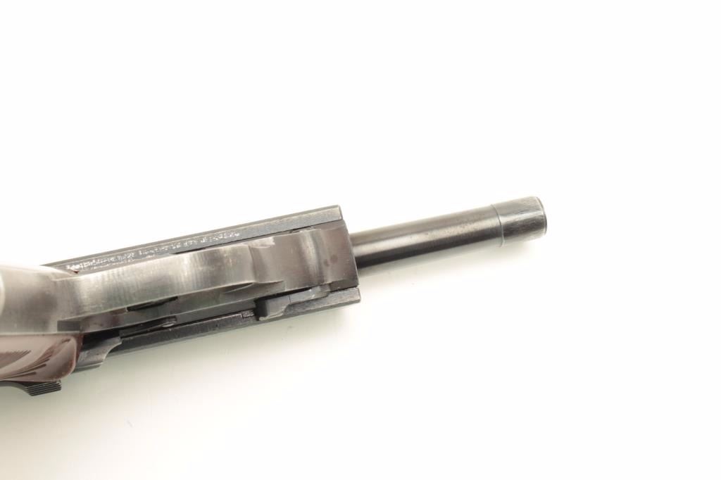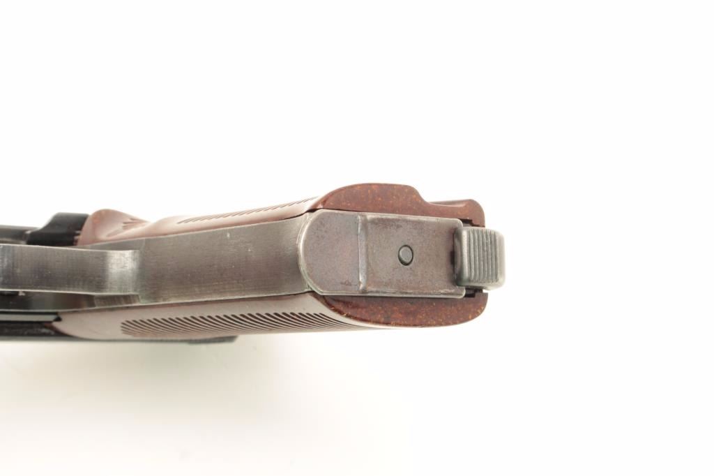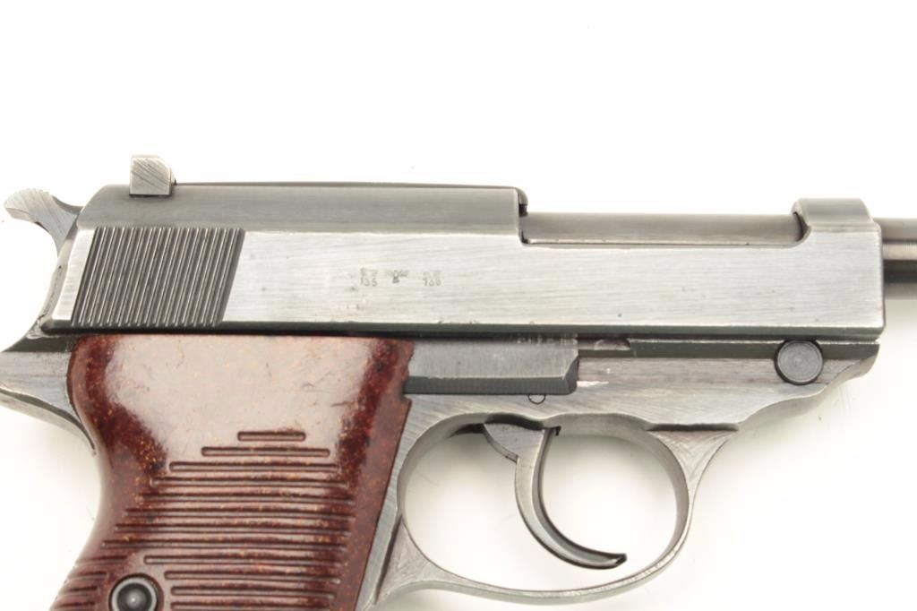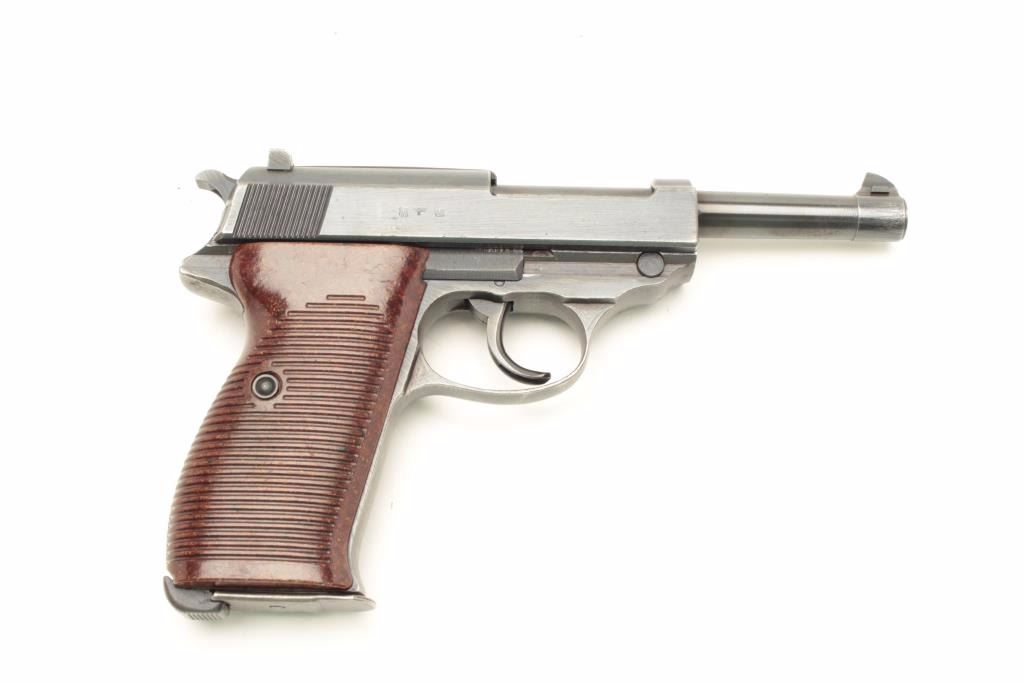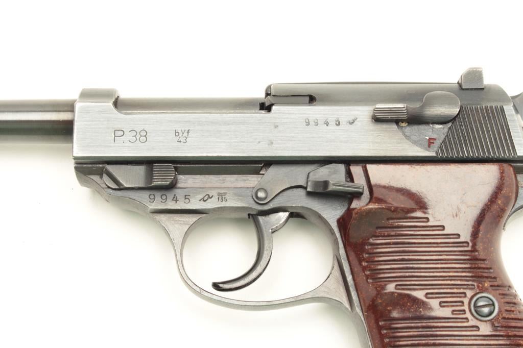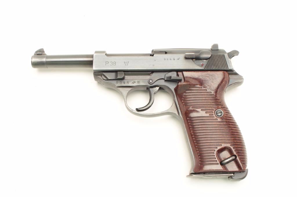 German P-38 byf 43 marked semi-automatic pistol, 9mm caliber, 4.75” barrel, military finish maroon grips, S/N 9945o, in overall very good to fine condition displaying the majority of its military finish, fine bore,crisp action, sharp markings and fine grips. (C&R/No PPT). Est.: $500-$1,000.