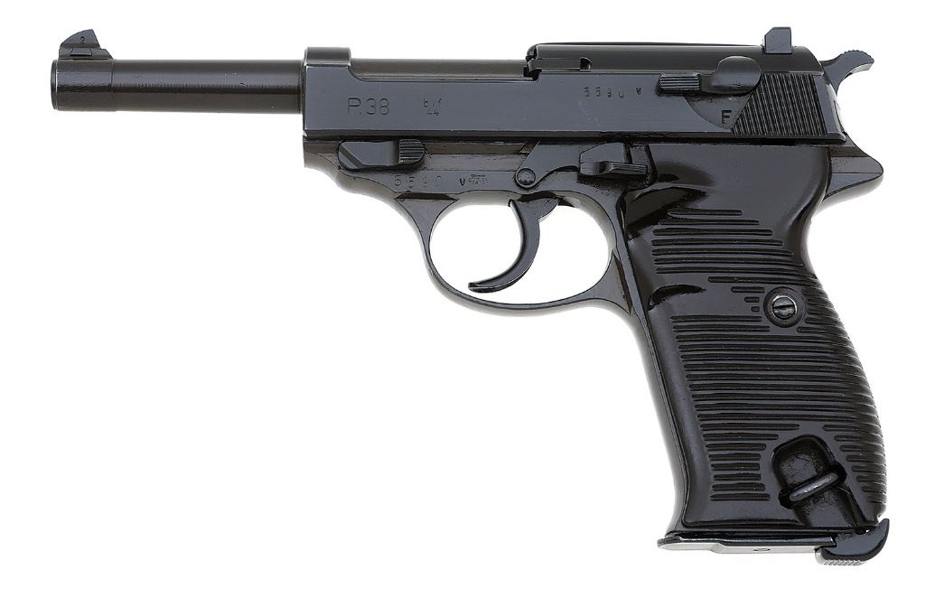 serial #5590v, 9mm, 5'' barrel with a bright excellent bore. The metal surfaces retain about 98% original blue showing a hint of high edge wear and some sparse handling marks, the barrel taking on a deep plum tone under bright light as is fairly typical. All markings remain intact and strong showing proper eagle firing proofs and ''(Eagle) / WaA135'' Waffenamts. The grooved dark brown phenolic resin grips remain in excellent condition showing a few minor handling marks. All of the serialized parts are matching and the pistol includes one refinished jvd-coded magazine. A fine later war P.38 pistol. (13A11728-932) {C&R} (1000/1500)