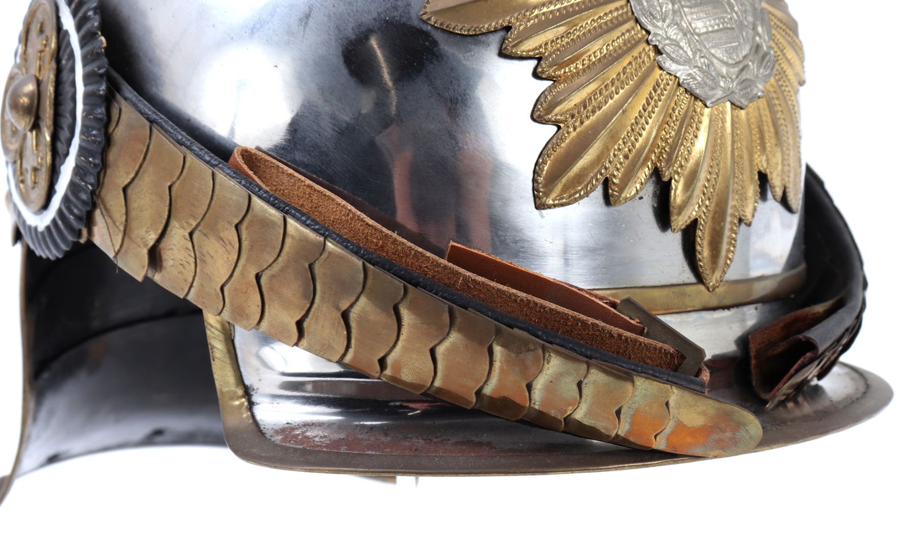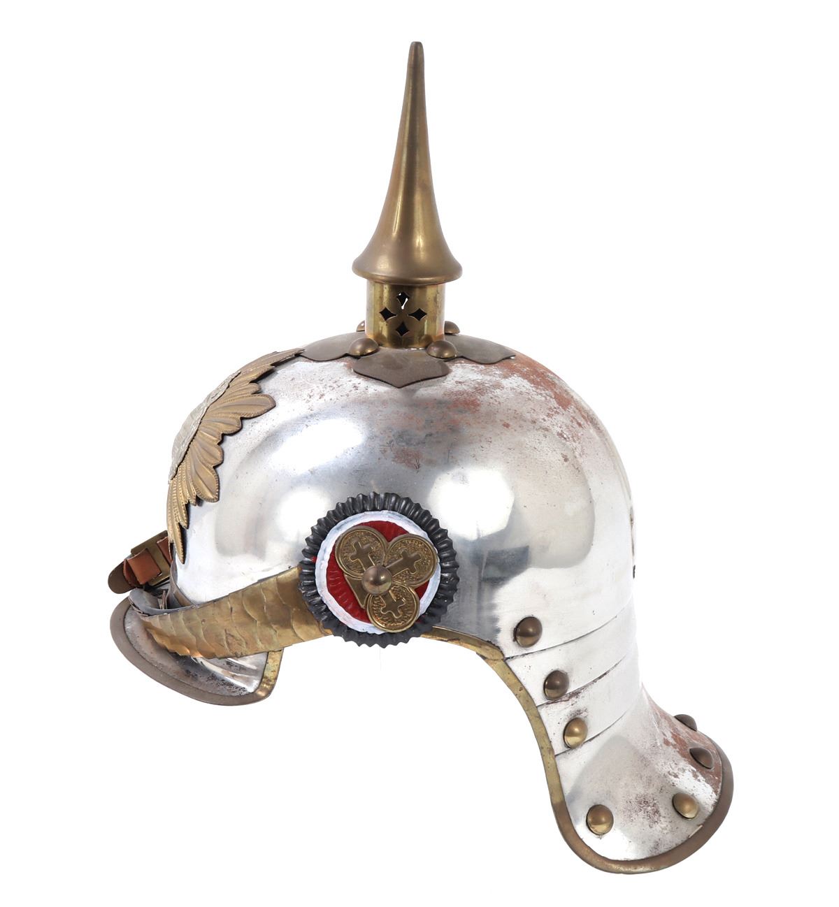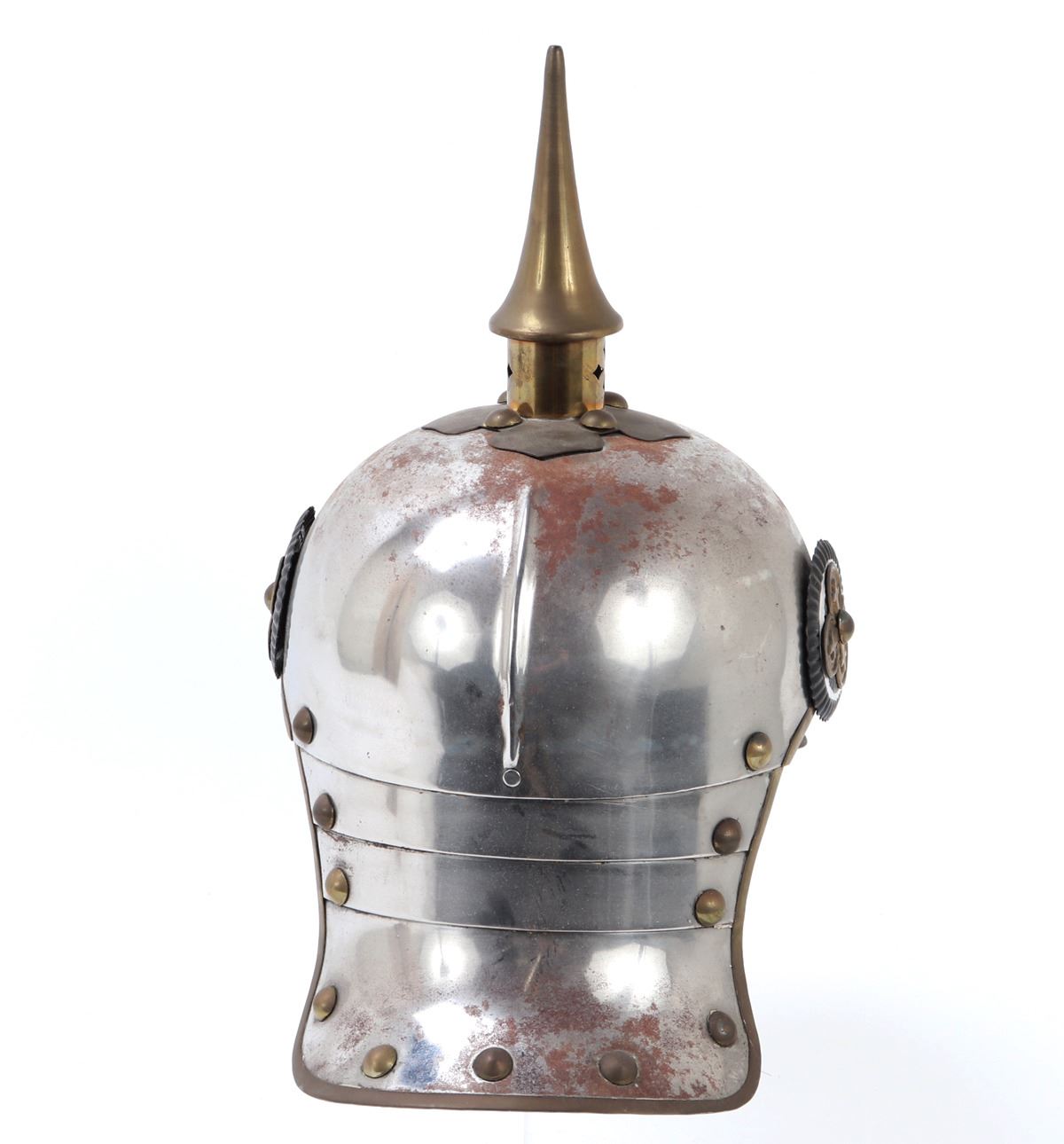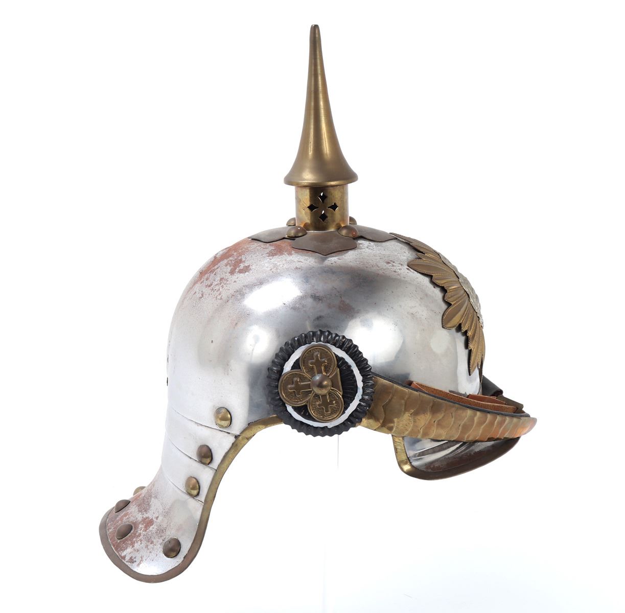 Old German Pickelhaube style helmet appears to be in a large size. Large top central spike with a coat of arms in front over a brass background. Size 11 3/4" L x 8 1/4" W x 14" H, Weight 2 lb. 11.8 oz. Condition: Light wear and oxidization from age and use. Leather in good condition. Provenance: Southern California Collection