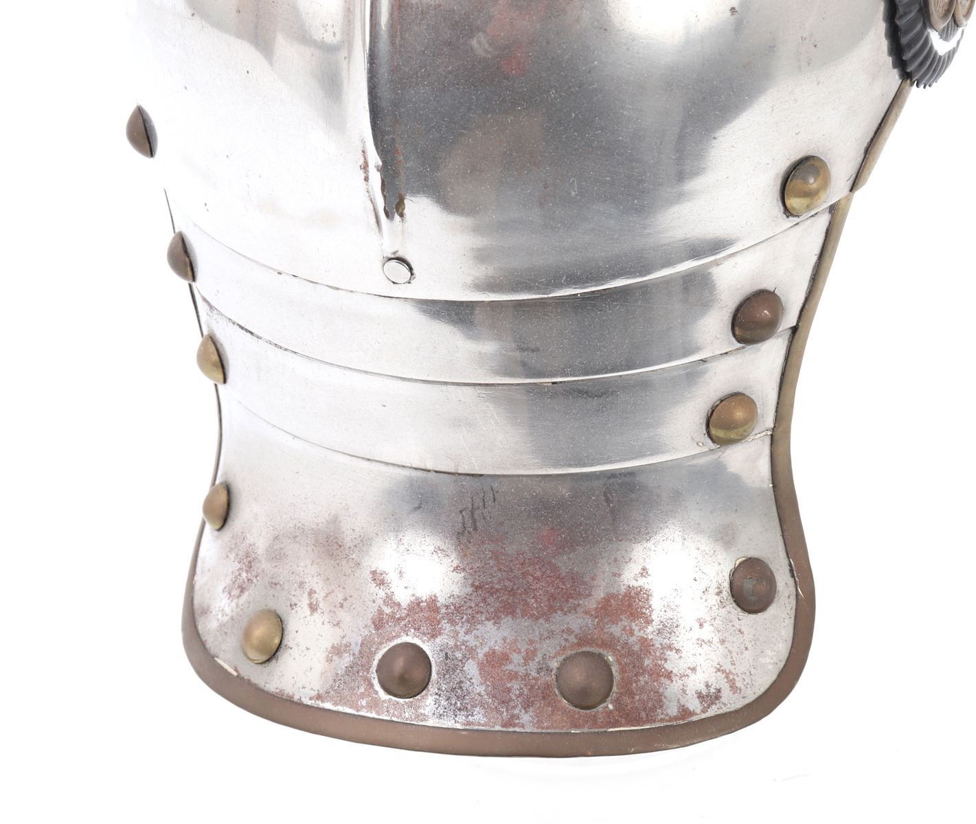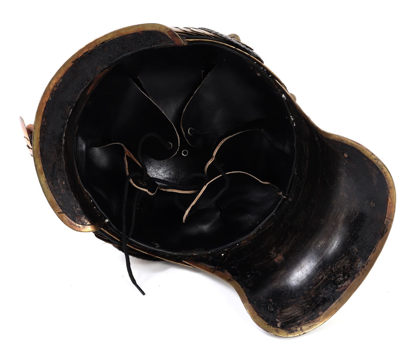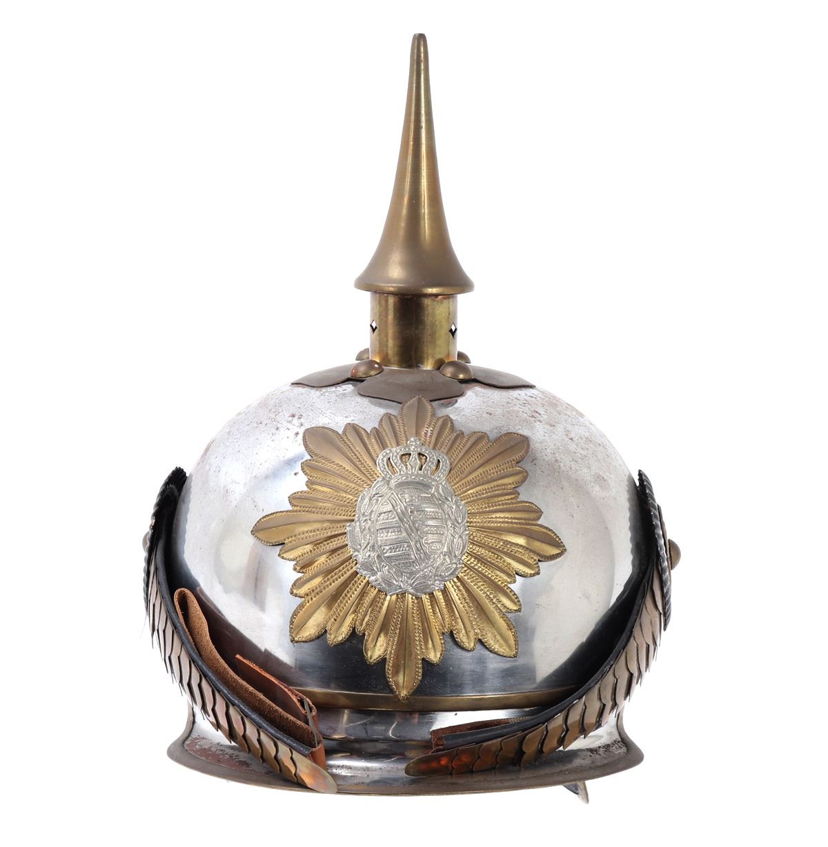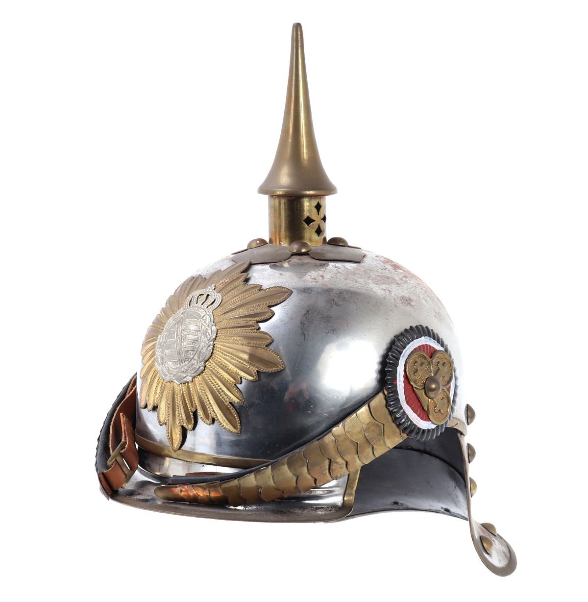 Old German Pickelhaube style helmet appears to be in a large size. Large top central spike with a coat of arms in front over a brass background. Size 11 3/4" L x 8 1/4" W x 14" H, Weight 2 lb. 11.8 oz. Condition: Light wear and oxidization from age and use. Leather in good condition. Provenance: Southern California Collection