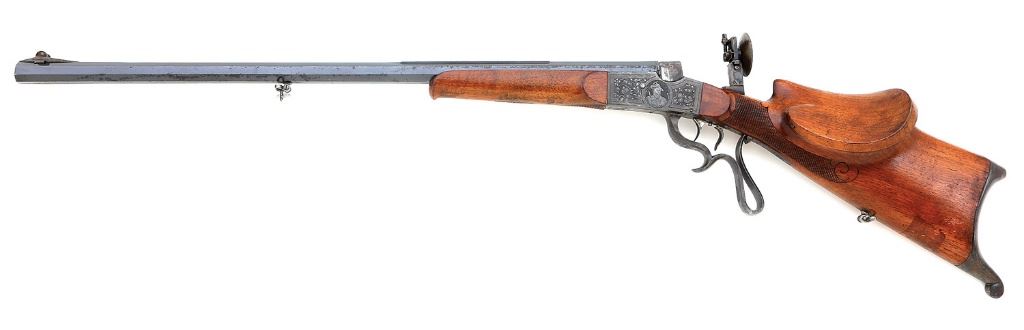 serial #H3041, 22 LR, 27 1/2'' octagon ''barrel'', 21'' true barrel with a bright excellent bore. This nice rimfire short range schuetzen rifle appears to be unmarked as to maker or retailer. The barrel retains about 75% original blue with most of the loss due to some scattered areas of old oxidation and some light pitting particularly along the left side. The top flat is grooved and there are dual silver band inlays at the breech. The action retains a similar amount of nice mostly vibrant case-hardened colors toning to smoky patina and with some overall fine oxidation speckling. The action is embellished with light Germanic foliate motifs with punch-dot background shading and burnished accents, both sides also with portraits of traditional riflemen. The checkered walnut buttstock and forend remain in very good plus condition showing some scattered light dings, a few more noticeable small abrasions along the forend and a thin crack along the edge of the right-side thumb rest. The stock features left-side ramshorn cheekpiece and other traditional hardware. The rifle is sighted with adjustable tang sight with wide aperture disc and protected bead on ramp front. The action with double set triggers seems to function well mechanically. A nice rifle in a desirable configuration that could no doubt still be used in smallbore competition. (13B11108-58) {C&R} [Tom Devers Collection] (1000/1500)