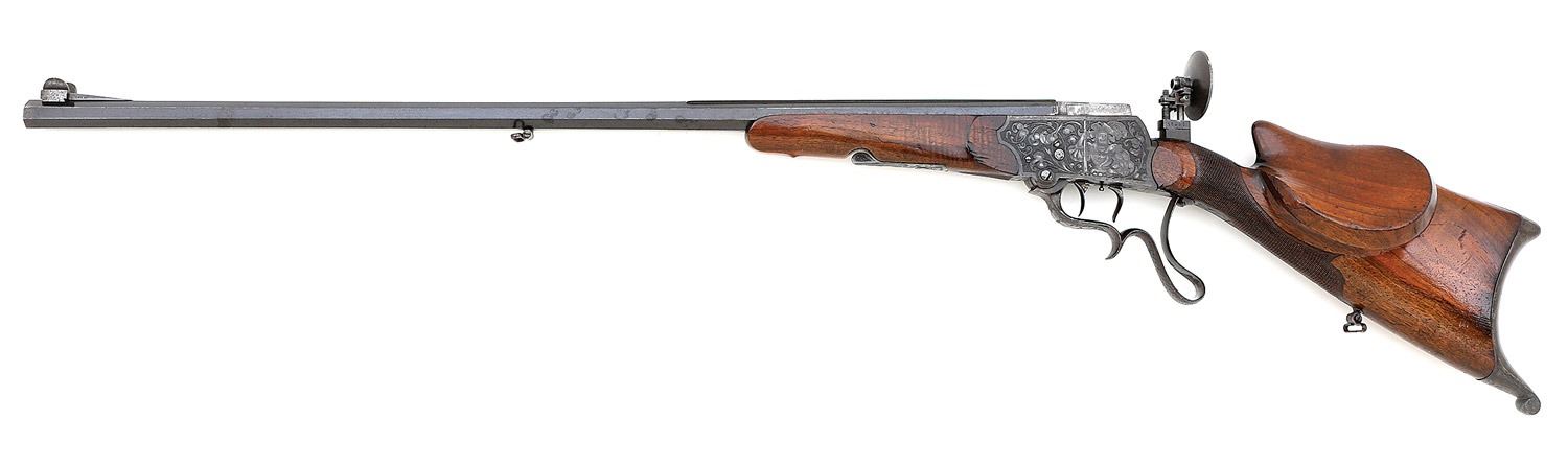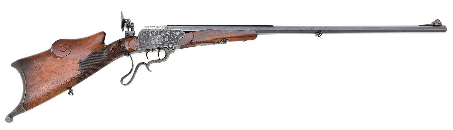 8.15x46R, 30 3/4'' octagon barrel with a bright very fine bore showing some scattered small areas of light oxidation and otherwise crisp rifling throughout. The barrel retains about 85% original blue appearing stronger under ambient light with areas toning to mild gray-brown patina under bright light and some scattered old oxidation. The top flat is neatly matted and grooved for sights, also showing ''SYSTEM ALBRECHT'' in silver. The action retains perhaps 80% nice original case-hardened colors that remain mostly vibrant with areas toning to gray-brown and showing some scattered mild oxidation speckling. The action is extensively embellished with wide flowing Germanic foliate motifs and punch-dot shading with subtle burnishing accents, the left with renaissance rifleman and the right with a target scorer holding target. The smooth walnut forend remains in fair condition showing some moderate chips along the length of the right side and the buttstock remains in about very good plus condition showing overall light dings and handling marks. The checkering remains mostly intact and strong and the stock features medium-sized left-side rams horn cheekpiece and right-side thumb rest. The schuetzen buttplate shows some moderate old oxidation mixing with vibrant wisps of case-hardened colors and the rifle is equipped with sling swivels, double set triggers, fully-adjustable tang sight with wide aperture disc numbered ''15211'' and protected ramp front sight with three selectable posts. The breechblock drops straight down on this system and it also features a takedown mechanism with lever on the underside of the forend that unlatches and lifts up the barrel to be easily removed. This is a nice example of what appears to be a fairly obscure system. (13D11108-62) {C&R} [Tom Devers Collection] (2000/3000)