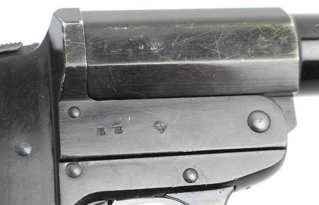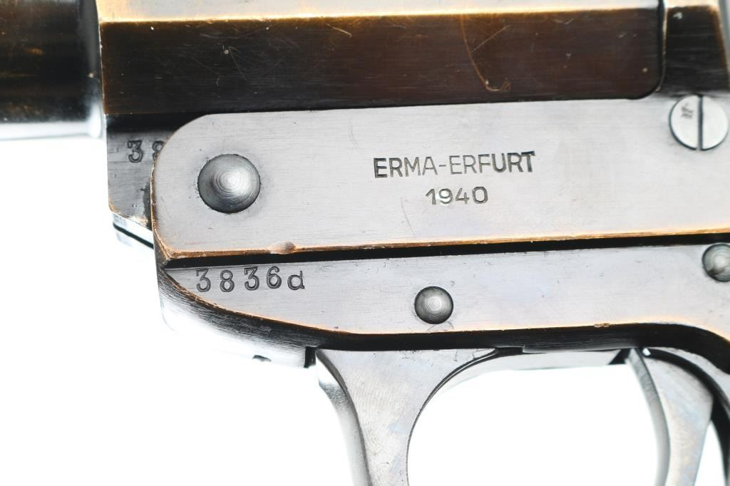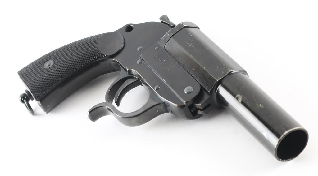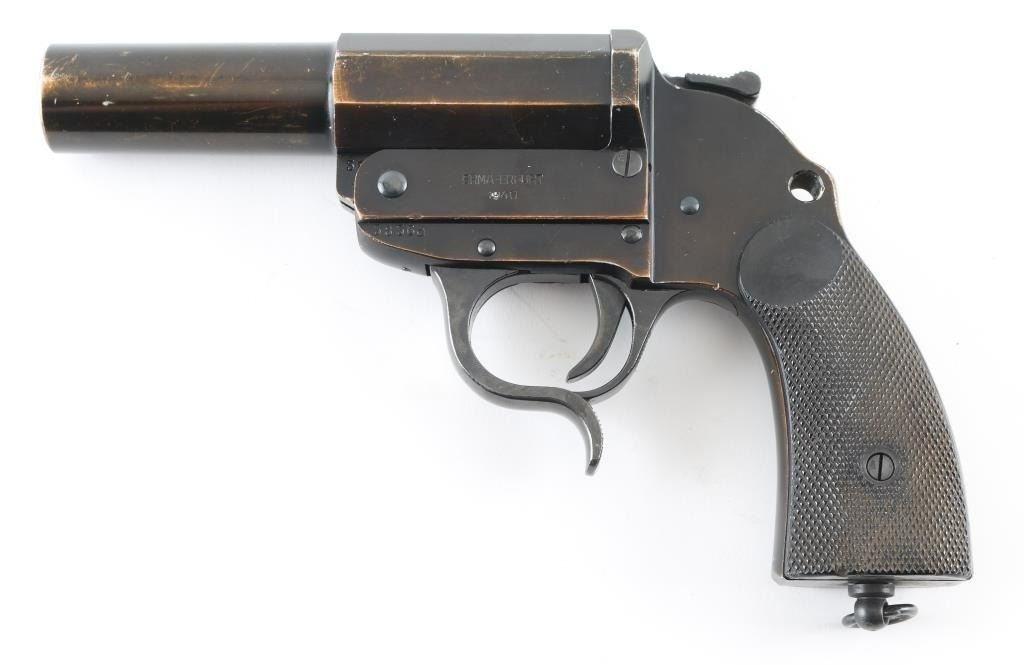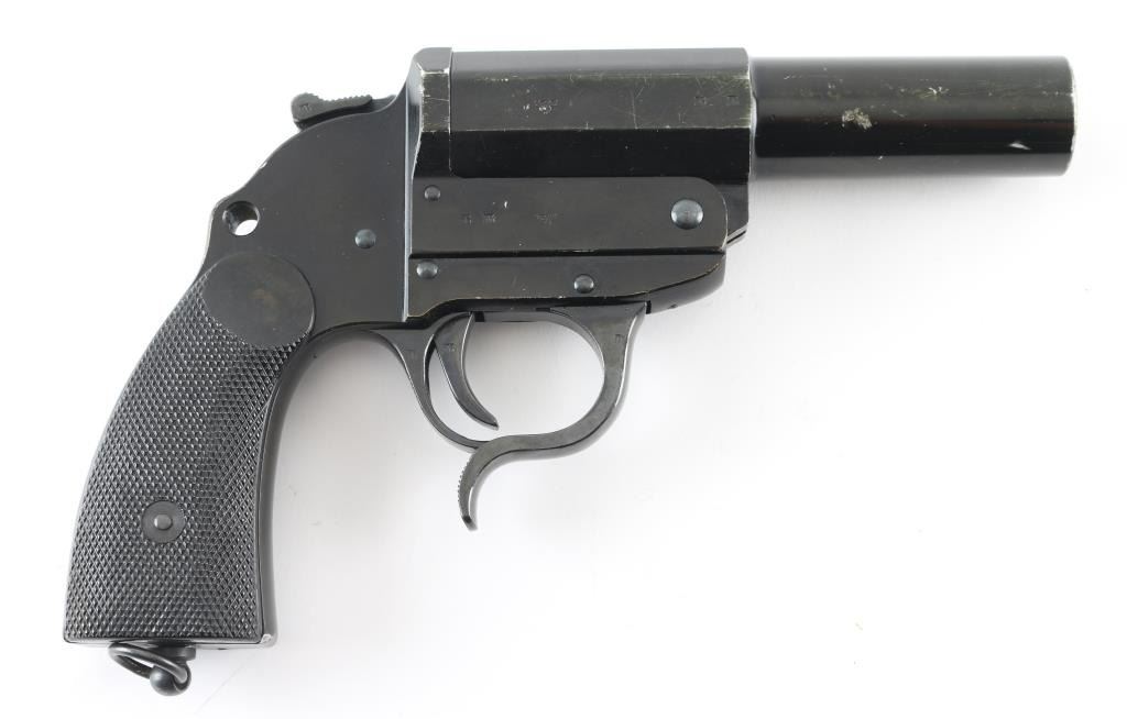 German Wehrmacht LP-34 signal flare pistol. 26.5mm. Large triggerguard for gloved hands. Checkered bakelite grips, lanyard ring , matching serial numbers. break-top by lever on triggerguard. Left frame marked "Erma-Erfurt, 1940", Waffenamts, Eagle/swastika proofs. Locks up tight, excellent bore, some edge wear on left side of barrel/frame.