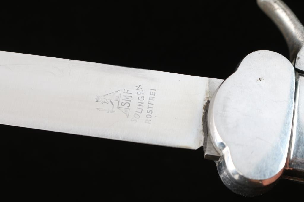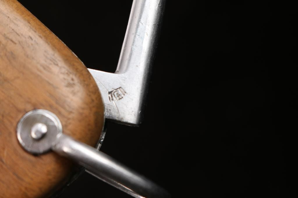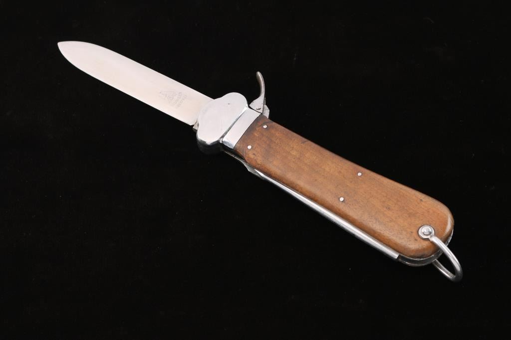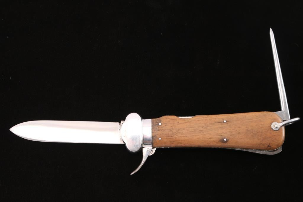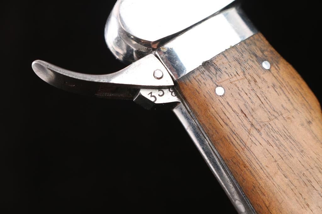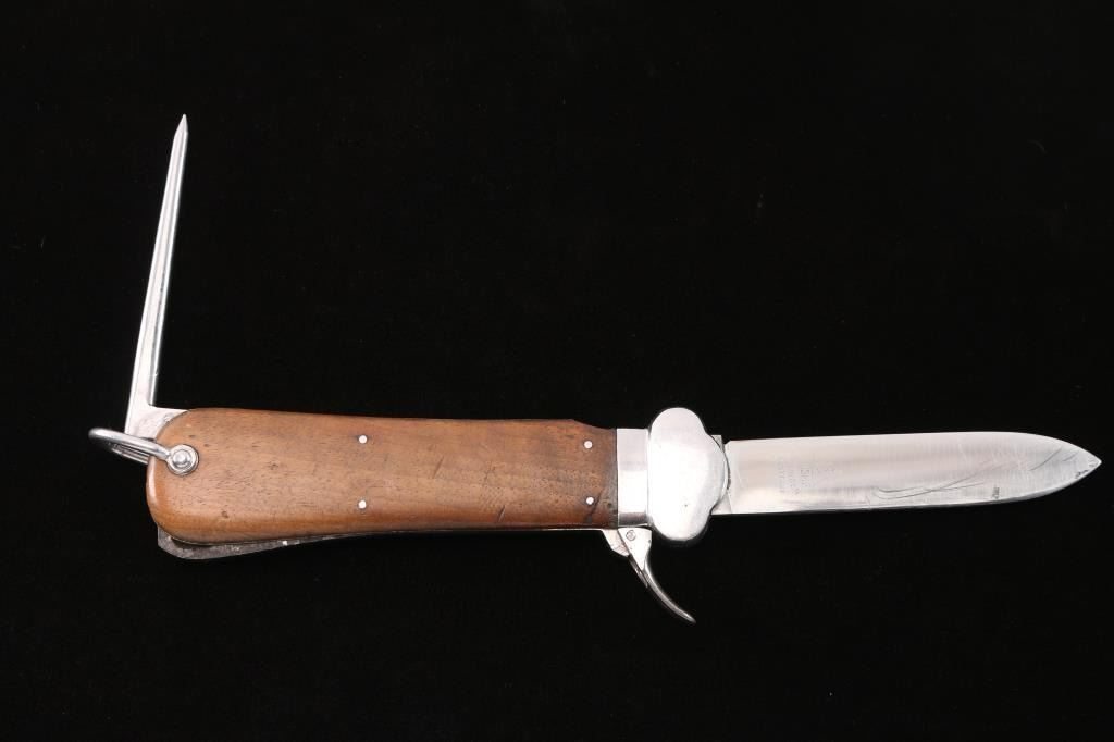 Original rare early German WWII Luftwaffe Paratrooper Gravity Knife By Solinger Metallwaren Fabrik – SMF. Type 1, officially known as the Flieger-Kappmesser, was introduced in 1937 and primarily issued to Luftwaffe paratroopers (Fallschirmjäger). The knife has a gravity-operated blade, the knife opens by flipping a lever and letting gravity slide the blade out, no spring or manual pulling required. The wooden grips of type 1 knives featured smooth wood, typically beech or walnut. It has a non-takedown design, unlike later models, the type 1 knives could not be disassembled for maintenance. The marlin spike was a fold-out spike used for untangling parachute cords or knots. Blade marked with the “Sitting King” SMF/ SOLINGEN and ROSTFREI logo on one side. Heavy-duty marlin spike, tip is intact; the base of the spike is stamped with an early “small” eagle 5 Luftwaffe proof mark, stainless steel metal parts stamped with production series number "338", original D-ring stainless steel shackle is intact. The 4' has some minor scratches with no sharpening or nicks, the wood scales are excellent. mechanically excellent. A rare knife in overall very good condition.