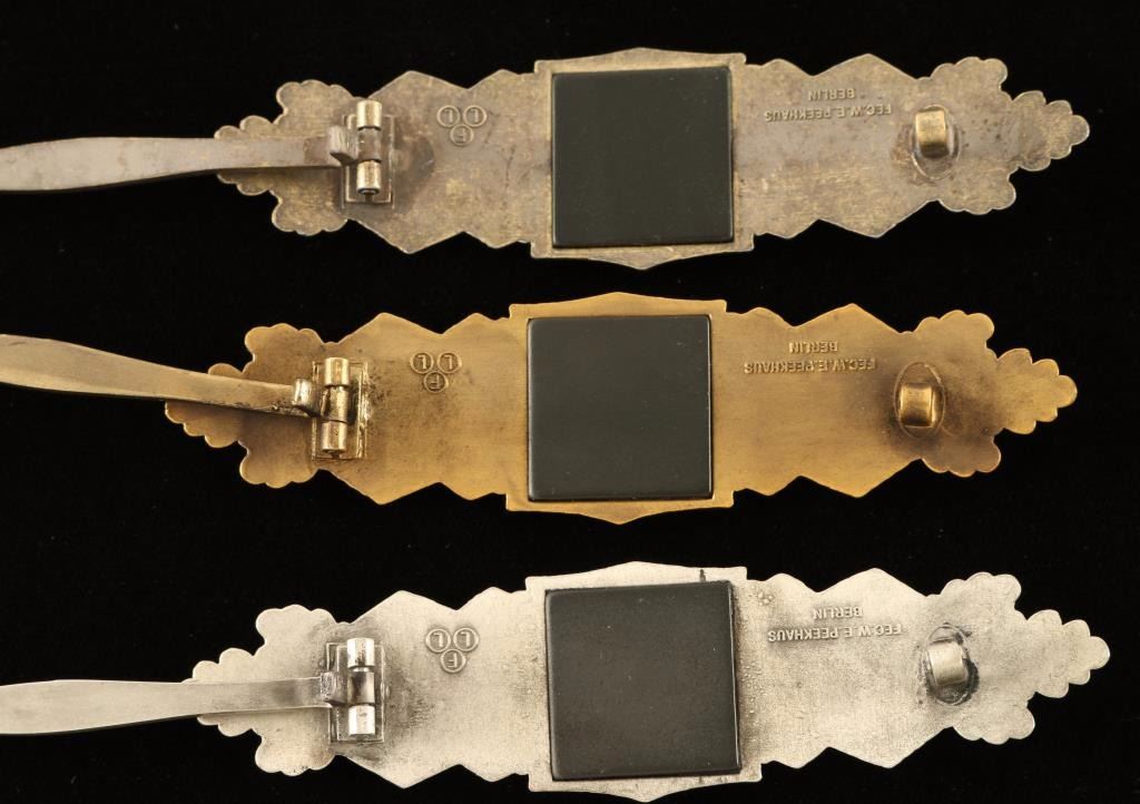 Close Combat Clasps. All three are maker marked 'Fec W E Peekhaus Berlin FLL'. They have a wide horizontal pin back. As is unknown age.