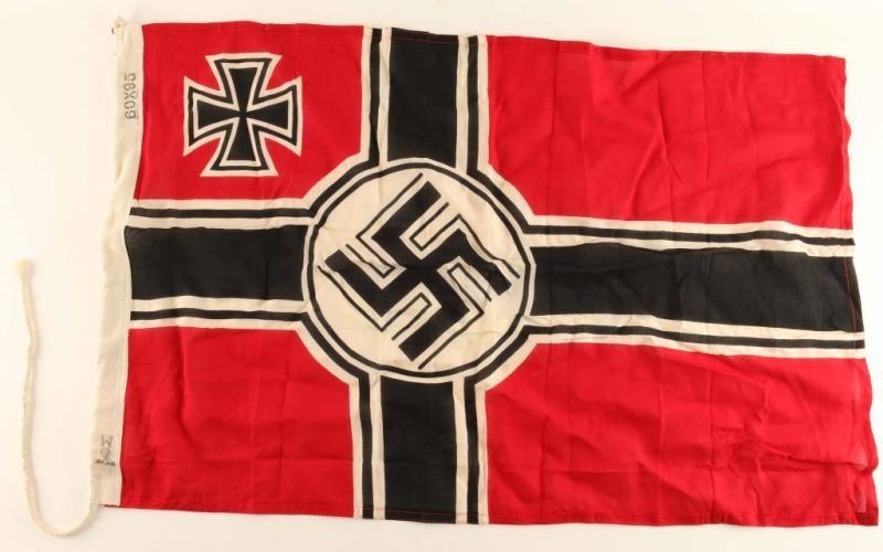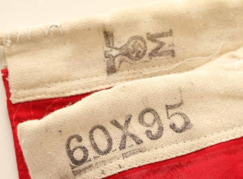 Battle Flag. Measures 23 1/4"w x 36 1/2"h. Has a cotton reinforced bunting with rope on one end. It is marked with an eagle 'M' and size marked 60 x 95. Printed cotton construction. Offered "as is", we don't guarantee the authenticity of this item, please do your research. All sales are final.