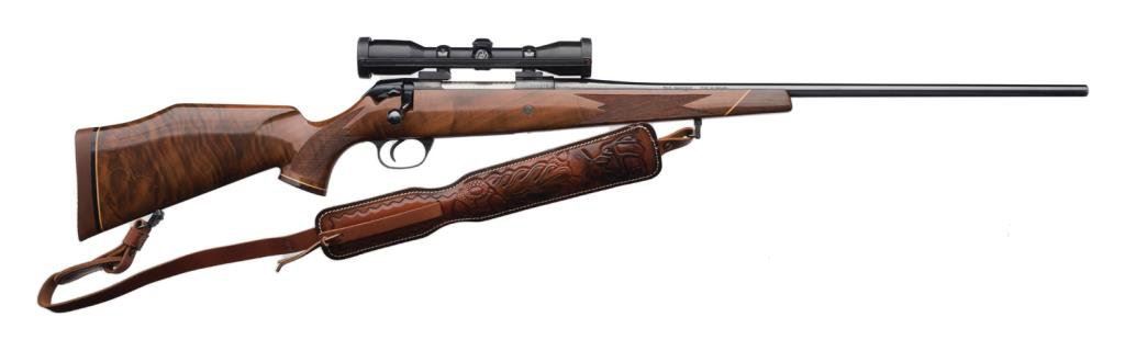 German-made Kleinguenthen bolt action rifle, .300 Win. Mag. caliber, 26” round barrel, S/N 866970, blued finish, deluxe checkered wood stock with leather sling and quick release sling swivels, hard rubber butt pad and mounted with a Zeiss 6 X 32 scope displaying fine optics. This rifle is in overall fine condition with a fine bore, crisp action and markings; wood stock is also fine. Est.: $1,000-$2,000.