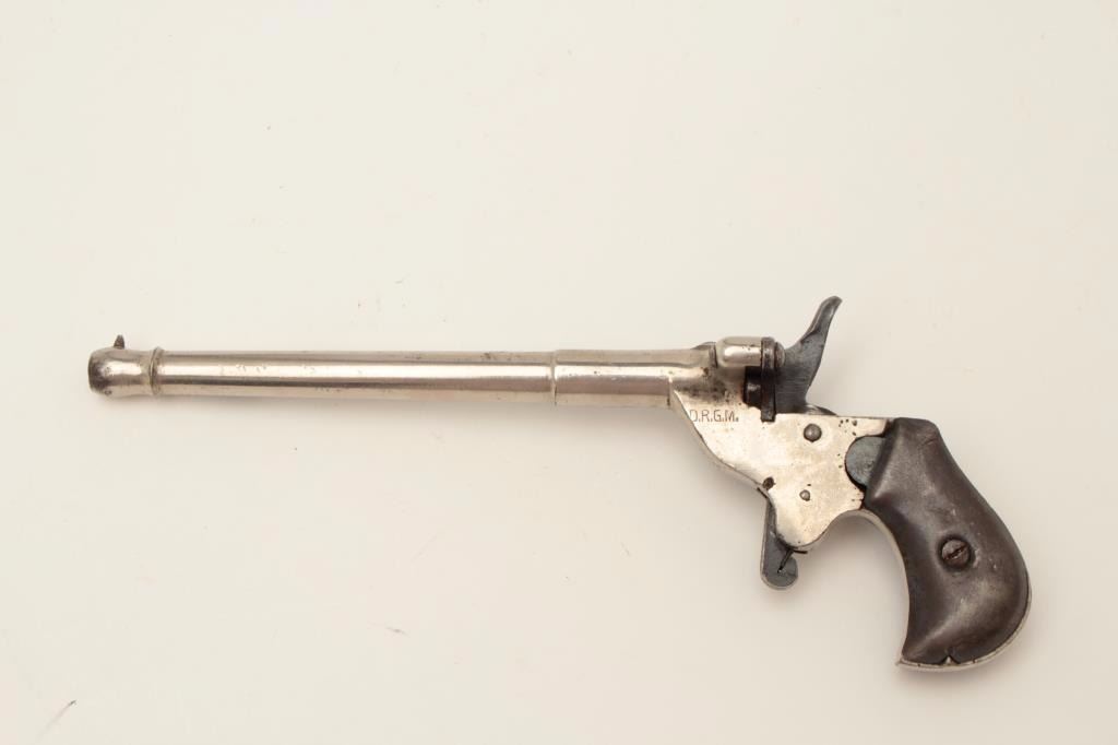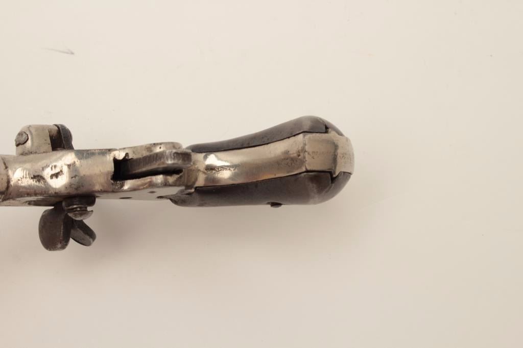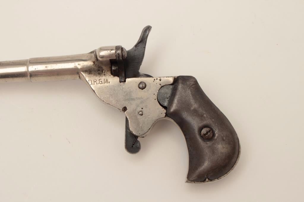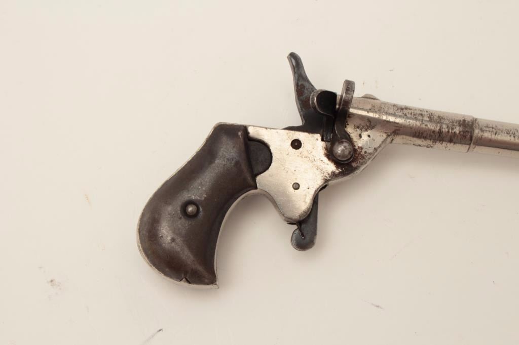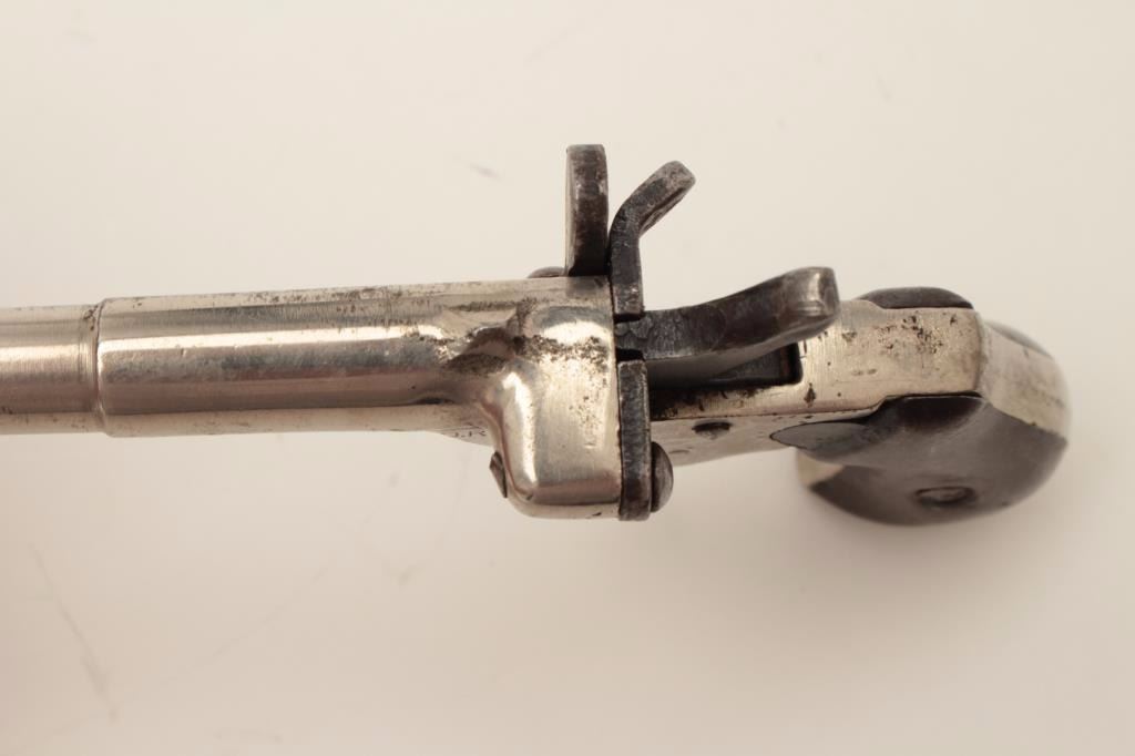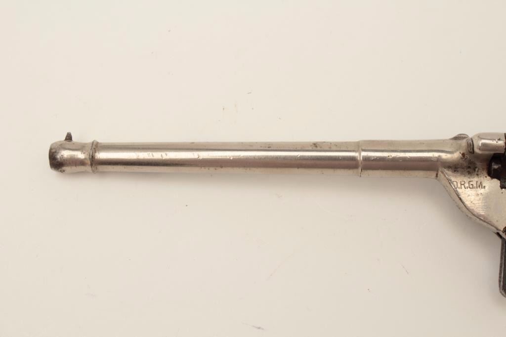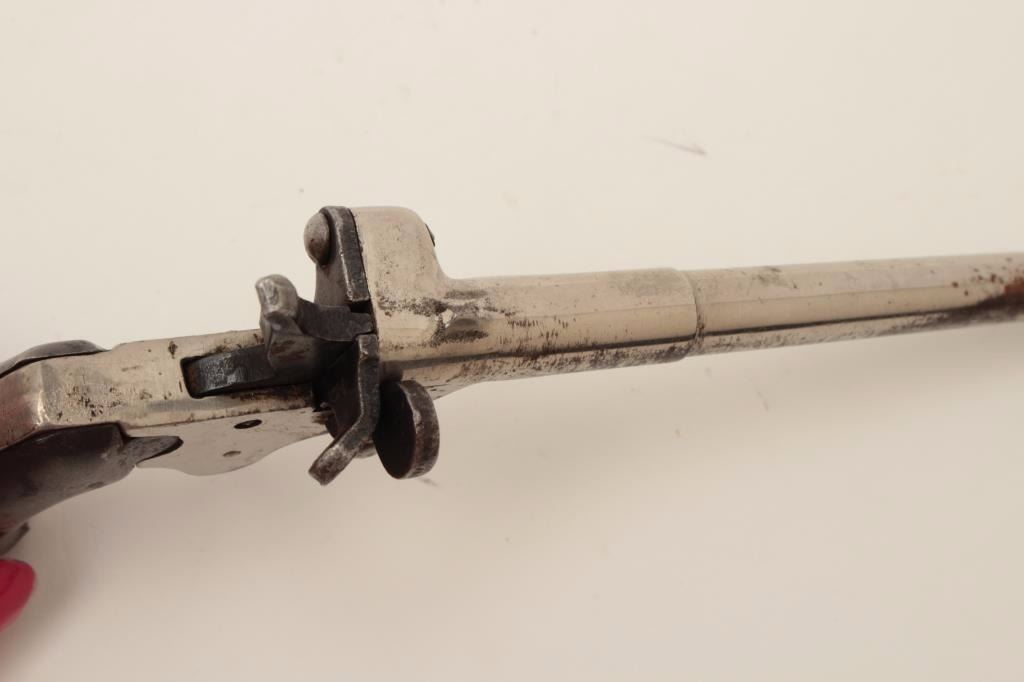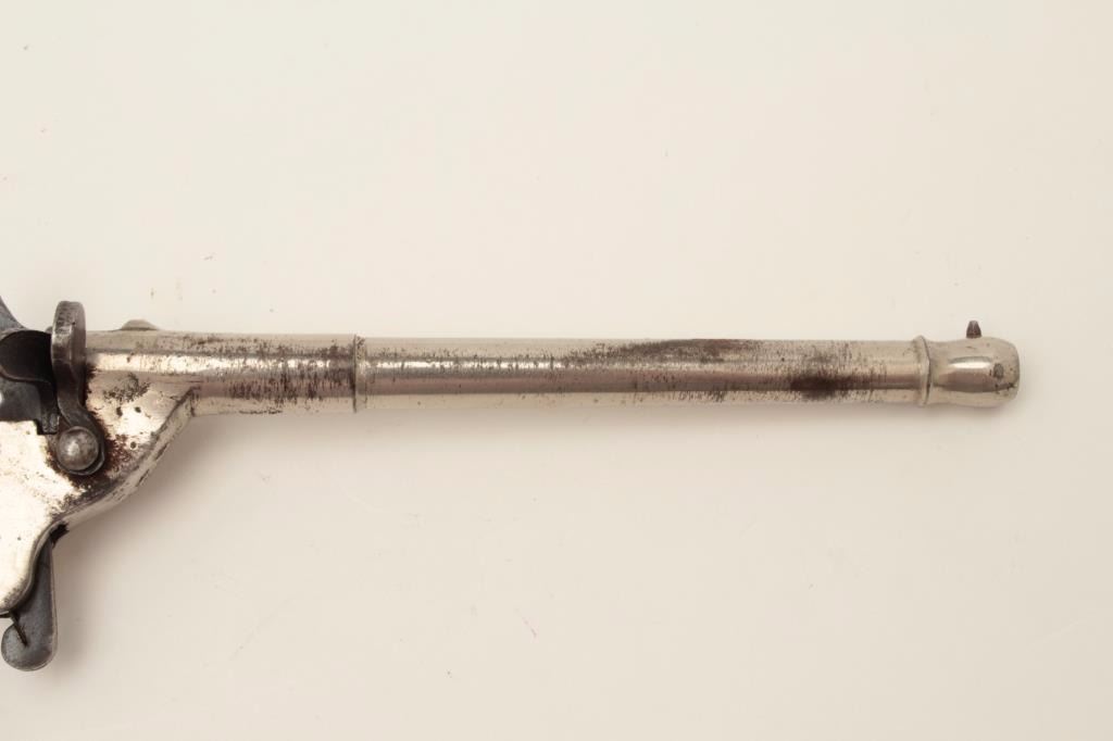 German parlour pistol, .22 caliber, 5” barrel, nickel finish, metal grips, no visible S/N, in over