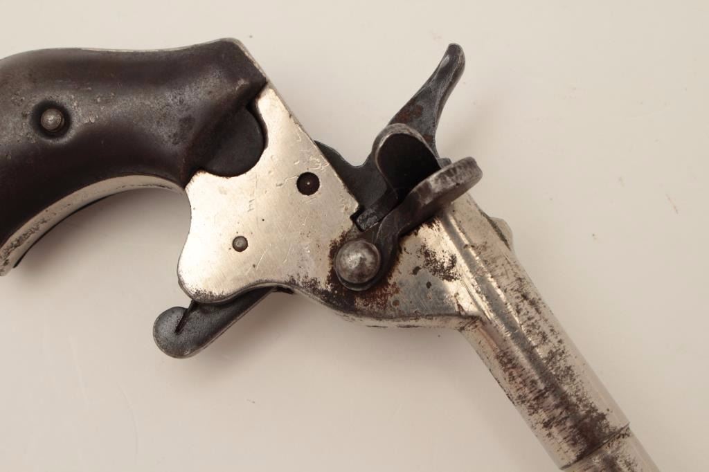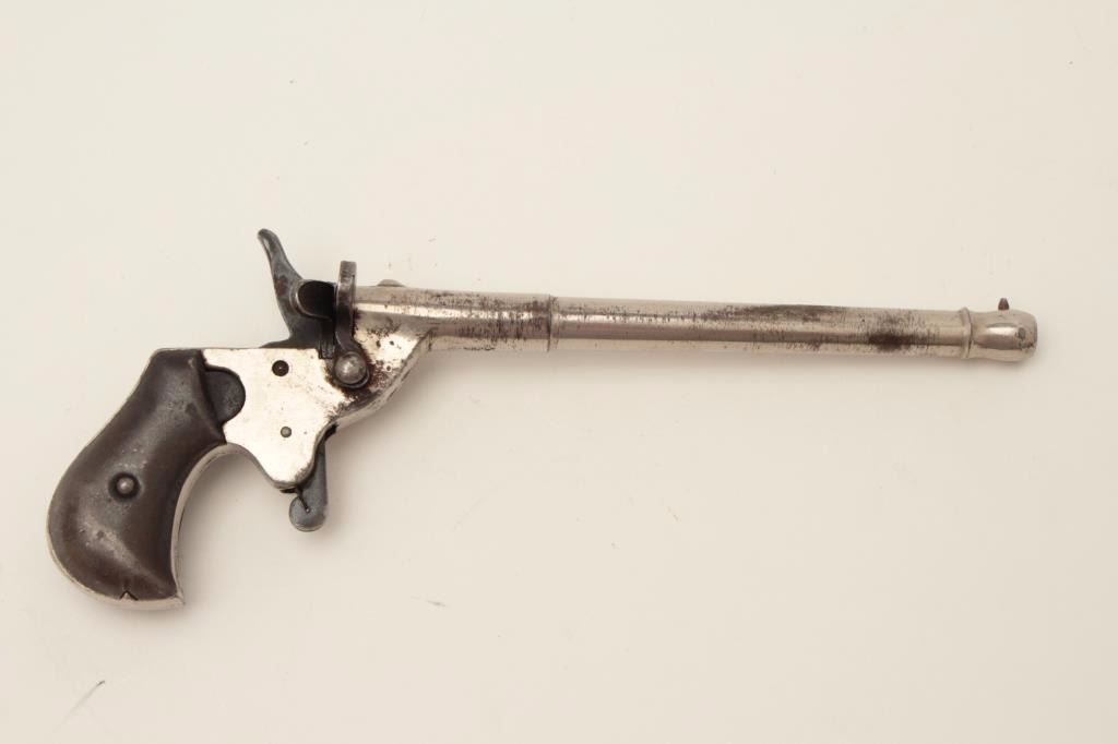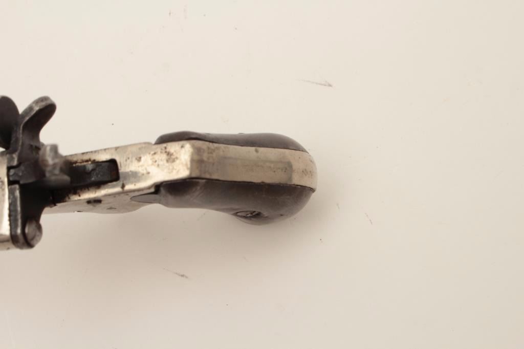 German parlour pistol, .22 caliber, 5” barrel, nickel finish, metal grips, no visible S/N, in overall good condition. (Antique). Est.: $75-$150.