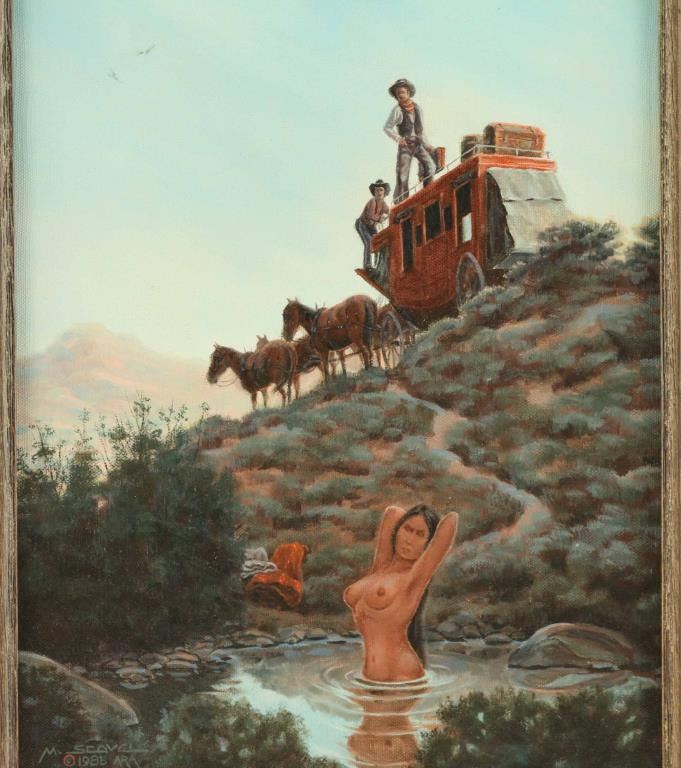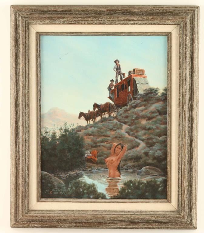 Depicting a stagecoach. Measures 13 1/2" x 10 1/2" in wood frame.