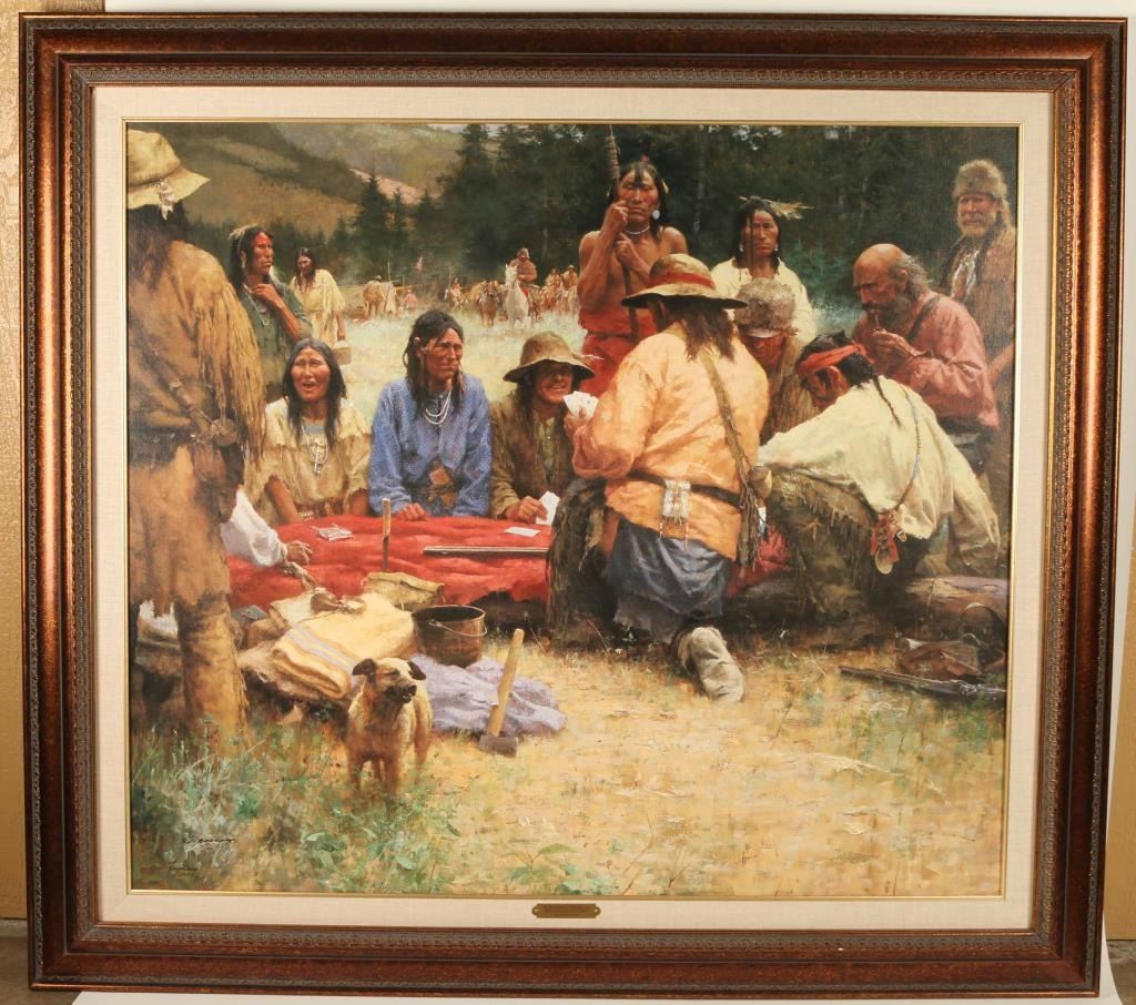 Howard Terpning, titled "A Friendly Game" image size is 40" x 39". In beautiful copper finish frame.