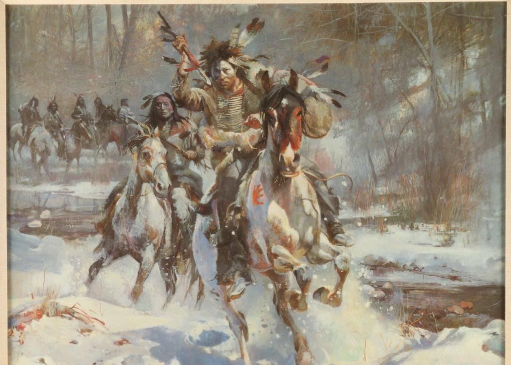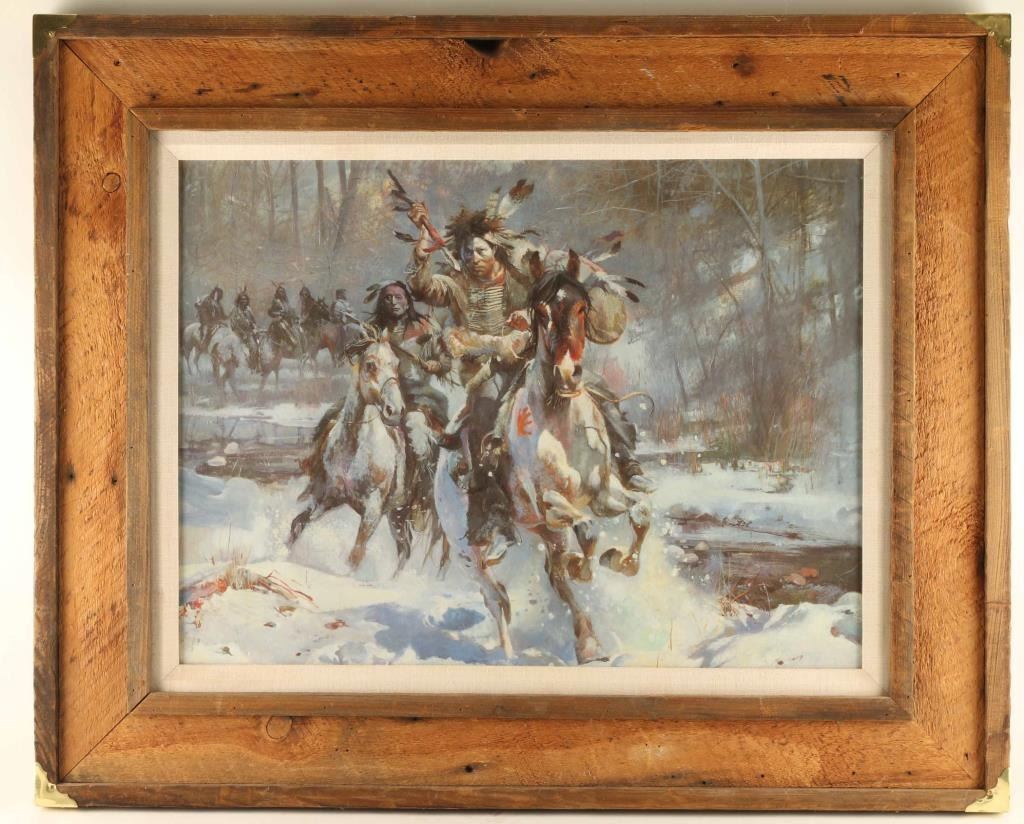 entitled "Short Bull- Wolf Mountain Skirmish", piece depicts Native Americans on horseback with war paint running through the snow. Framed with an image size of 22" x 30", part of a limited Giclee run of 300.