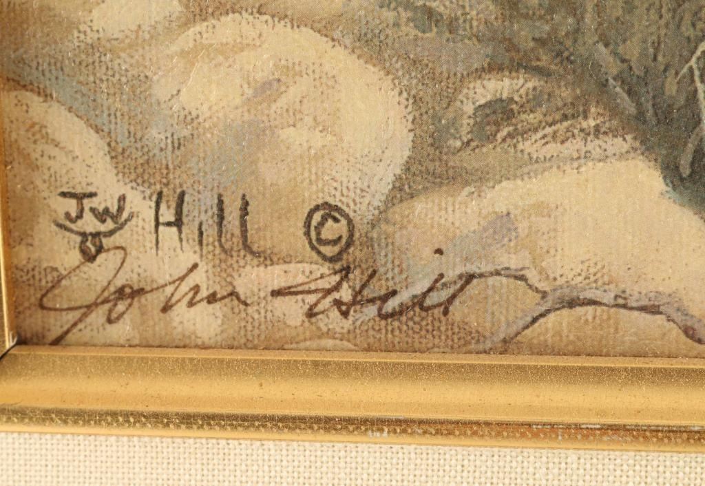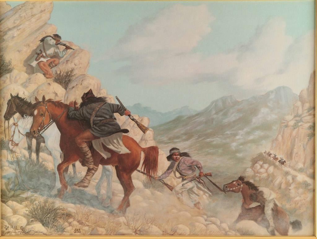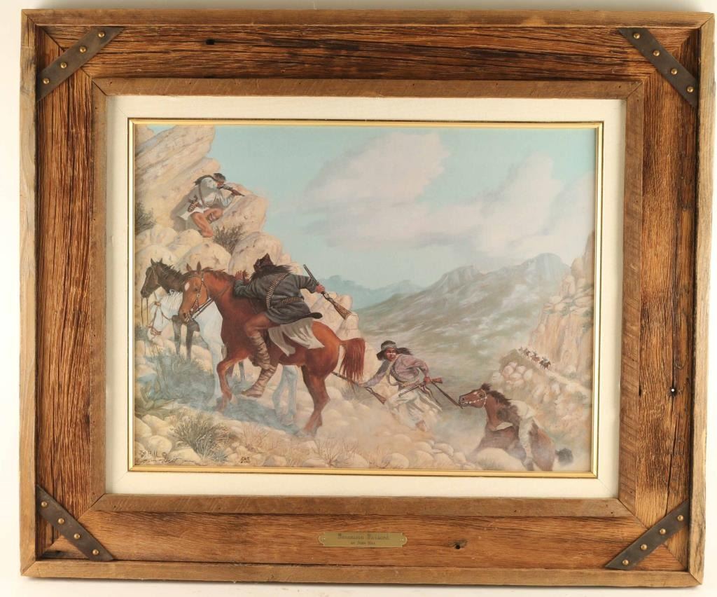 entitled "Geronimo Pursued", #262/600 and signed in the lower left hand corner, this piece depicts Geronimo and his band being pursued by the US Cavalry. Piece is framed and matted in a large wooden frame with a small plaque in the bottom center that reads "Geronimo Perused by John Hill". Image size is 23" x 17".