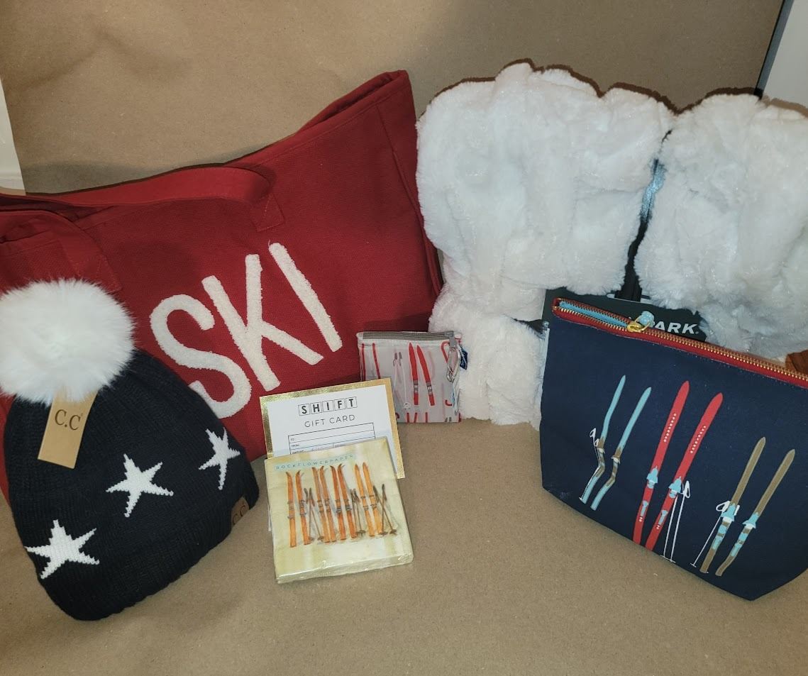 Hat,Plush Blanket, Bag w/SKI on side, Ski Print Zip Bag, Ski Print Foldable Shopping Bag, Ski Print Cocktail Napkins & $100 Gift Certificate Donated by Shift