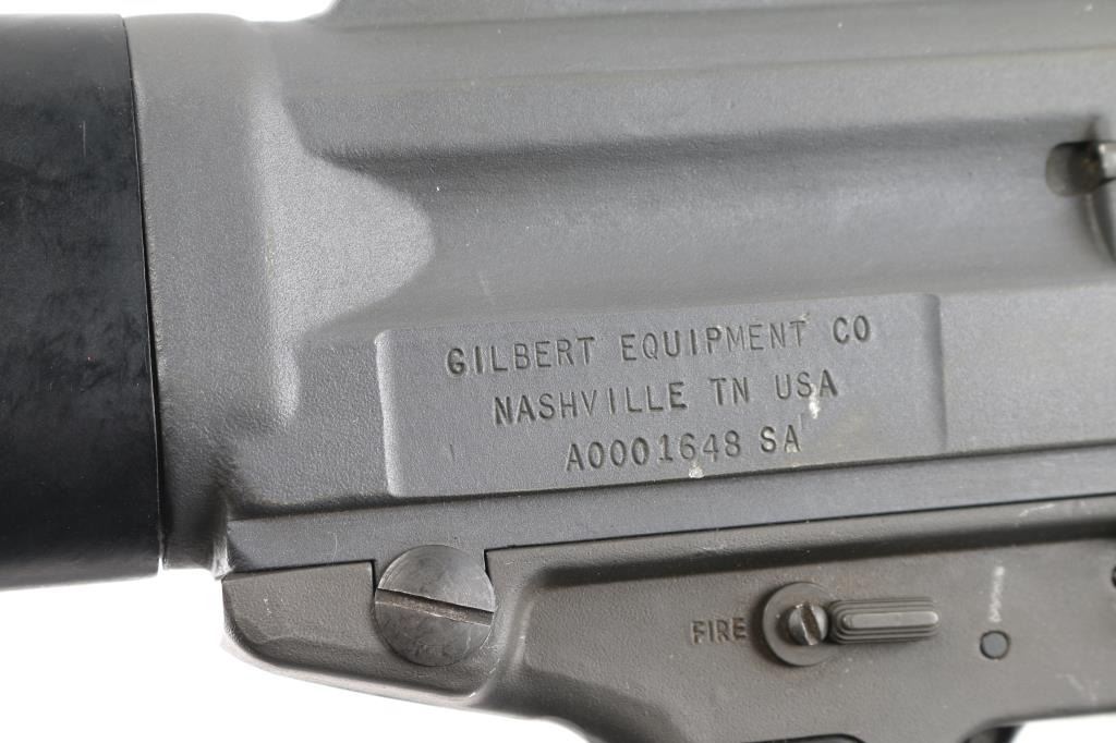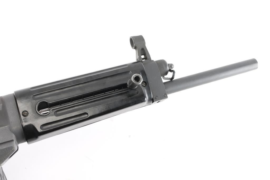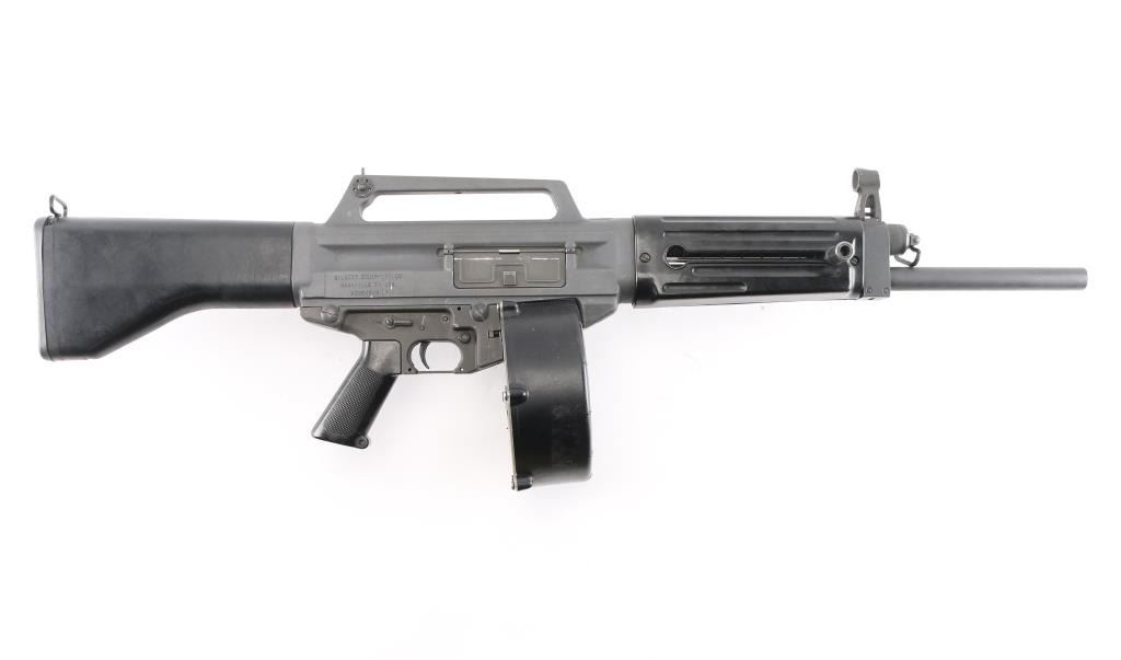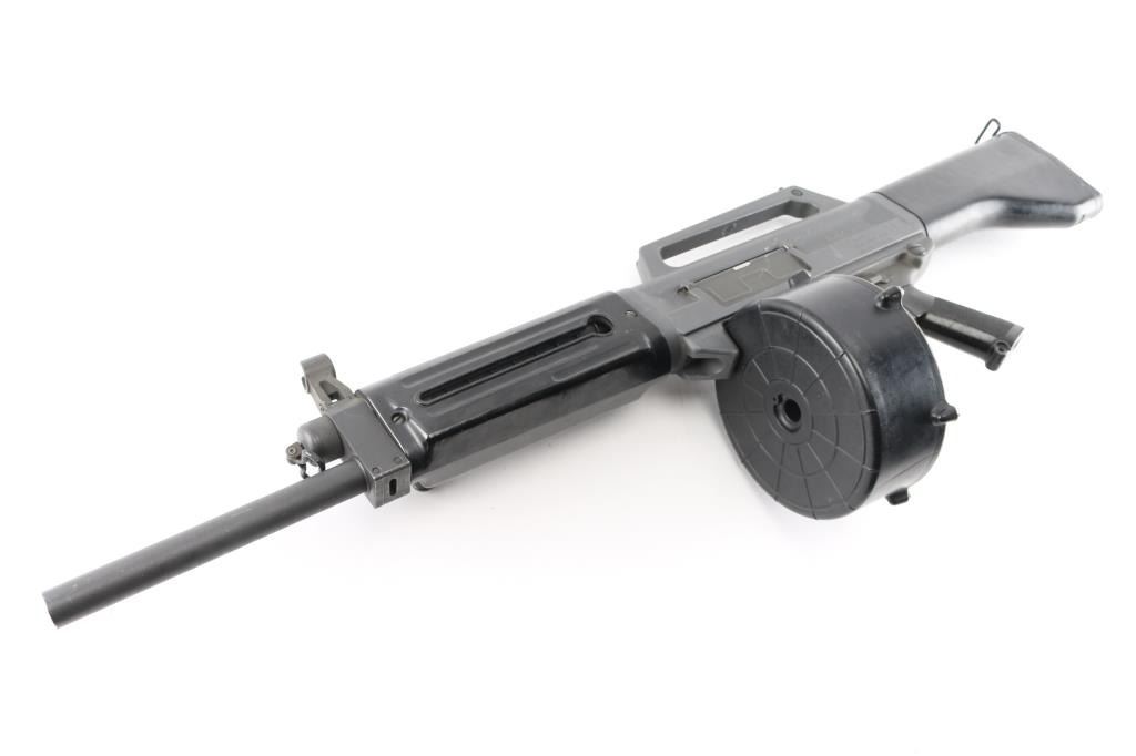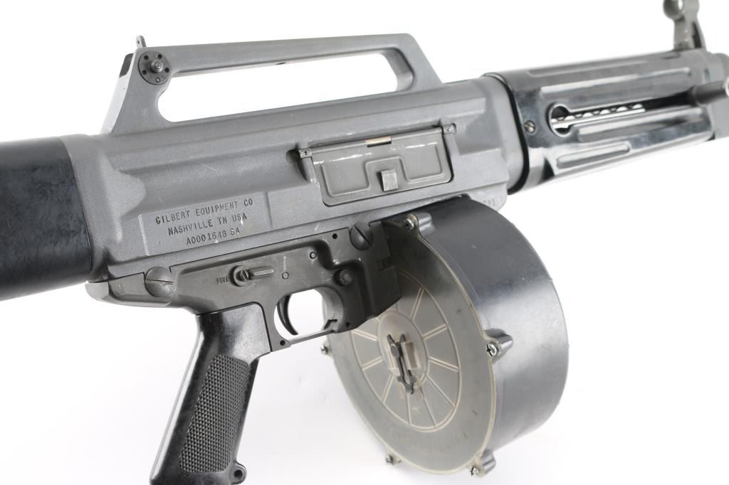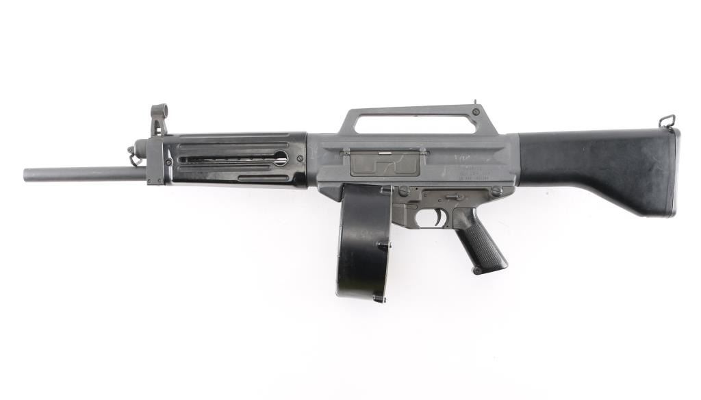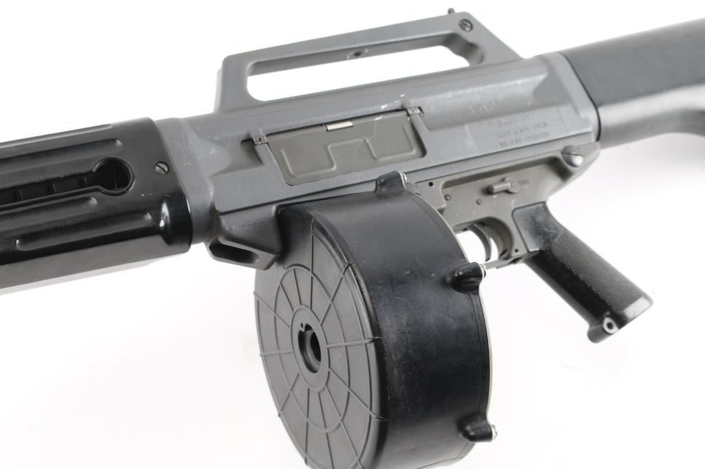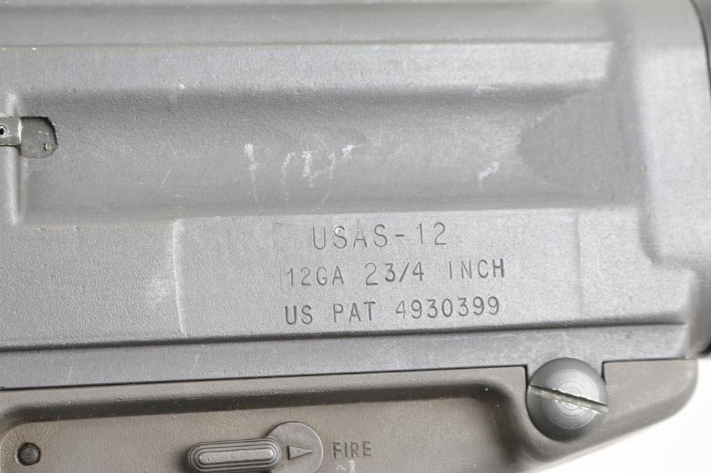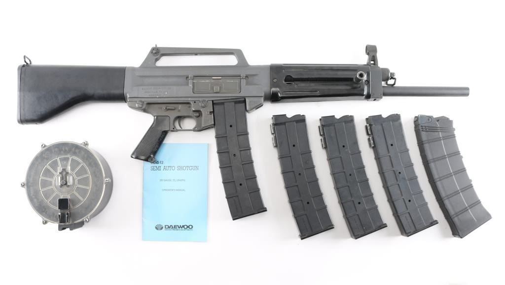 SN: A0001648SA Gilbert Equipment Company/Daewoo Precision USAS-12 Semi-Automatic Shotgun, Class III/NFA Destructive Device. Originally developed in the 1980s, the USAS-12 takes many design cues from Maxwell Atchisson's 1970s vintage Atchisson Assault Shotgun, being a gas-operated magazine fed shotgun patterned after the M-16/AR-15 family of rifles, in particular arranging the firearm to put the barrel as close in line with the shoulder as possible to diminish felt recoil. First conceived as a military weapon, Gilbert Equipment teamed up with Daewoo Precision Industries of South Korea to produce the USAS-12 as a full automatic shotgun for government contract sales, later formulating a semi-automatic model for the North American commercial market. Arriving on American shores in the late 80s and early 90s, the semi-auto USAS-12 soon ran face first into the Bureau of Alcohol, Tobacco, Firearms & Explosives, who used the wording of the National Firearms Act to have the shotgun (along with the cylinder-fed Armsel Striker-12, aka the Street Sweeper) declared a Destructive Device; while shotguns are traditionally given a pass on having a bore greater than a half-inch, this only legally applies to items "generally recognized as particularly suitable for sporting purposes", with said recognition more or less entirely hinging on the ATF's opinion on the matter. Elevation adjustable pin front and windage adjustable peep rear sights, with the former in a hooded post and the latter inside an integral carry handle, with a reversible cocking handle and ejector port cover, model and patent markings on the left side of the receiver and the Gilbert address and serial number on the right. The handguard is ribbed and ventilated, with an AR-style trigger group and pistol grip and a fixed plastic buttstock with a ribbed rubber buttplate. Included with the shotgun is five USAS-12 10 rd factory stick magazines, a 20 rd drum magazine and manual. The drum magazine has a hairline crack in it. Bore is excellent/bright, Overall very good with some minor scuffs on the receiver.