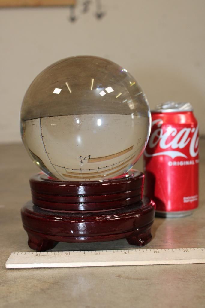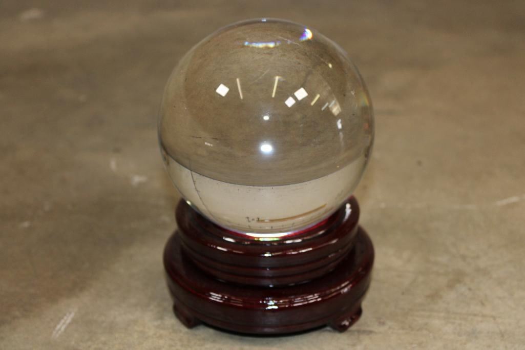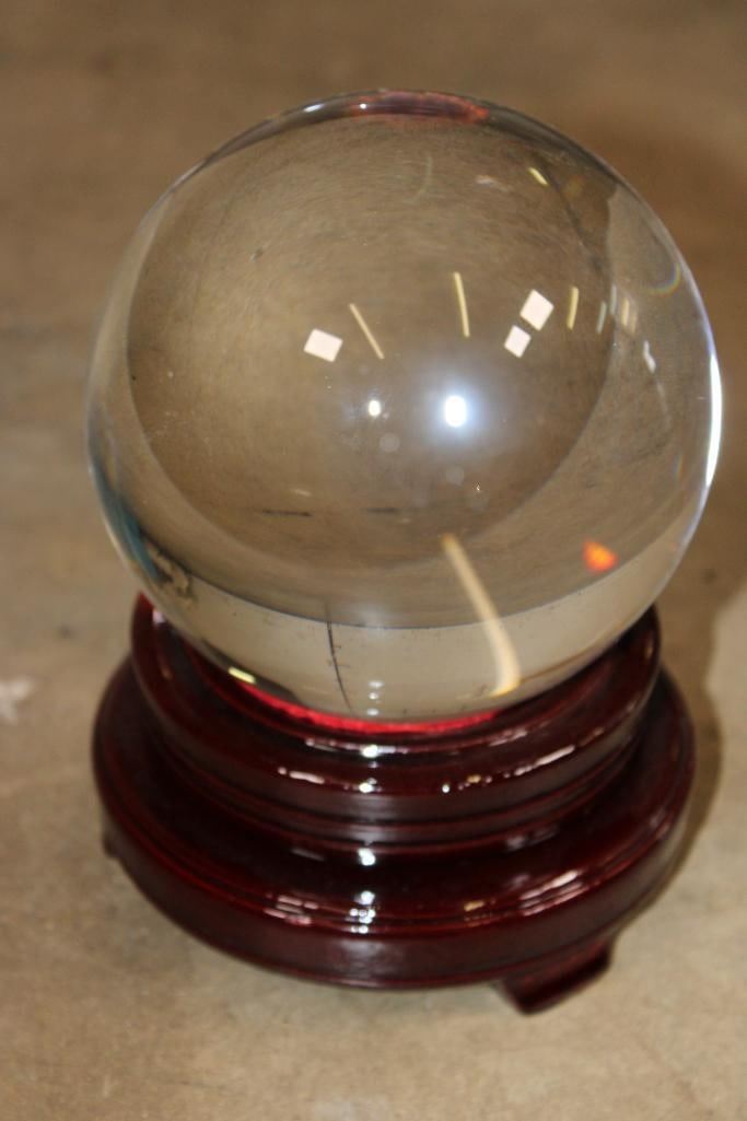 Glass "Crystal Ball" or Sphere With a Wooden Stand. The Crystal Ball measures 5" in Diameter. The Total Weight is 7 lbs. ODDITIES AND CURIOSITIES HOME DECOR